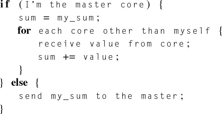 When the cores are done computing their values of , they can form a global sum by sending their results to a designated “master” core, which can add their results: