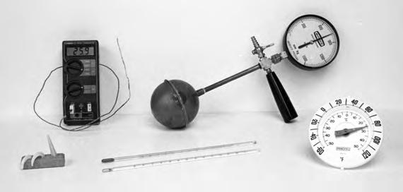 Figure1.2. Aselectionofthermometers.Inthecenteraretwoliquid-in-glass thermometers,whichmeasuretheexpansionofmercury(forhighertemperatures) andalcohol(forlowertemperatures).Thedialthermometertotherightmeasures theturningofacoilofmetal,whilethebulbapparatusbehinditmeasuresthe pressureofafixedvolumeofgas.Thedigitalthermometeratleft-rearusesa thermocouple—ajunctionoftwometals—whichgeneratesasmalltemperaturedependentvoltage.Atleft-frontisasetofthreepotter’scones,whichmeltand droopatspecifiedclay-firingtemperatures.