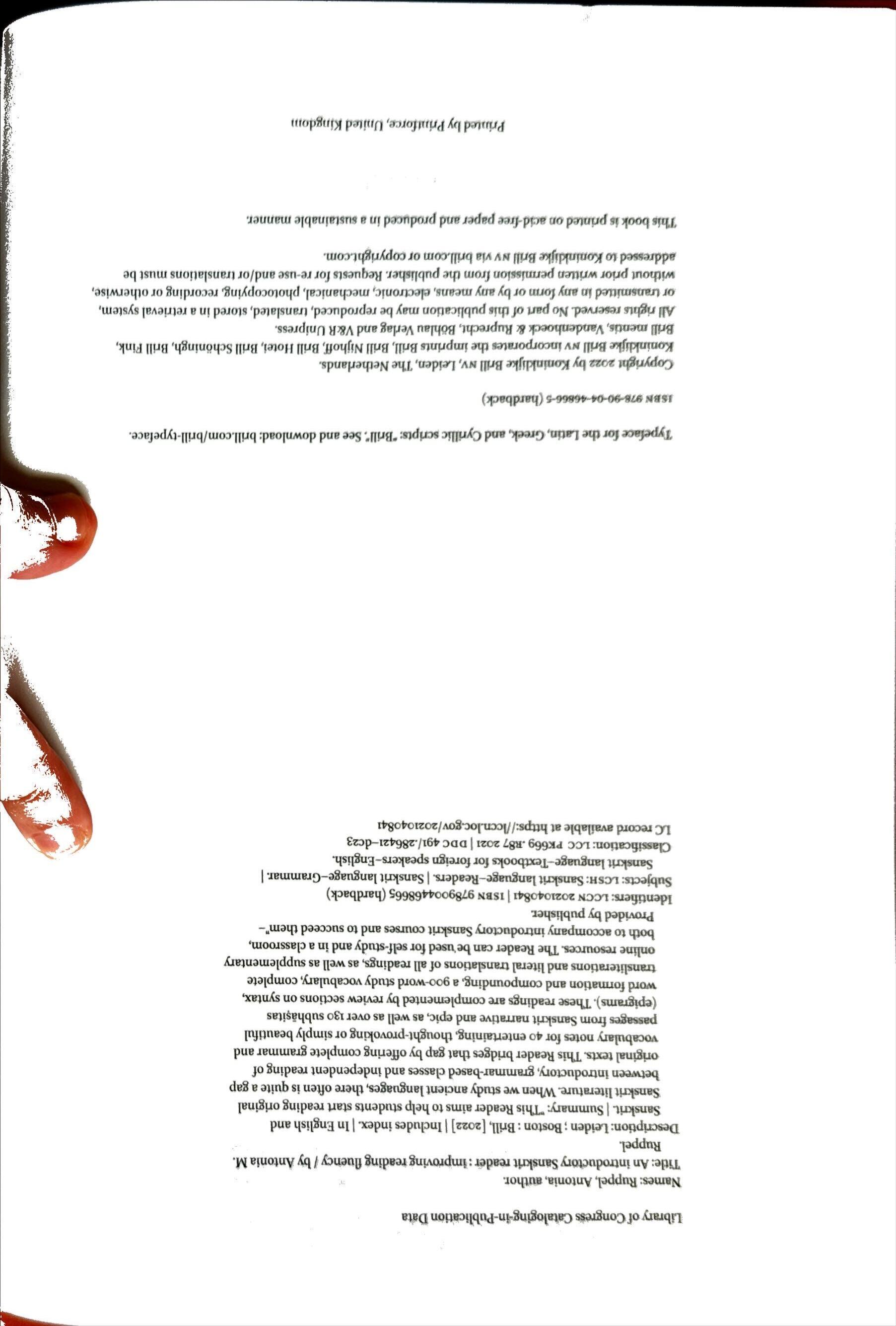 Description: Leiden;Boston:Brill,[2022]|Includesindex.|InEnglishand Sanskrit |Summary."ThisReaderaimstohelpstudentsstartreadingoriginal Sanskritliterature. Whenwestudyancientlanguages,thereoftenisquiteagap between introductory, grammar-based classesandindependentreadingof originaltexts.ThisReaderbridgesthatgapbyofferingcompletegrammarand vocabulary notesfor40entertaining,thought-provoking orsimplybeautiful passagesfromSanskritnarrativeandepic,aswellasover130subha§itas (epigrams).Thesereadingsarecomplemented byreviewsectionsonsyntax, wordformation andcompounding, a900-wordstudyvocabulary,complete transliterations andliteraltranslations ofallreadings,aswellassupplementary onlineresources.TheReadercanbeusedforself-studyandinaclassroom, bothtoaccompany introductory Sanskritcoursesandtosucceedthem"Providedbypublisher.
