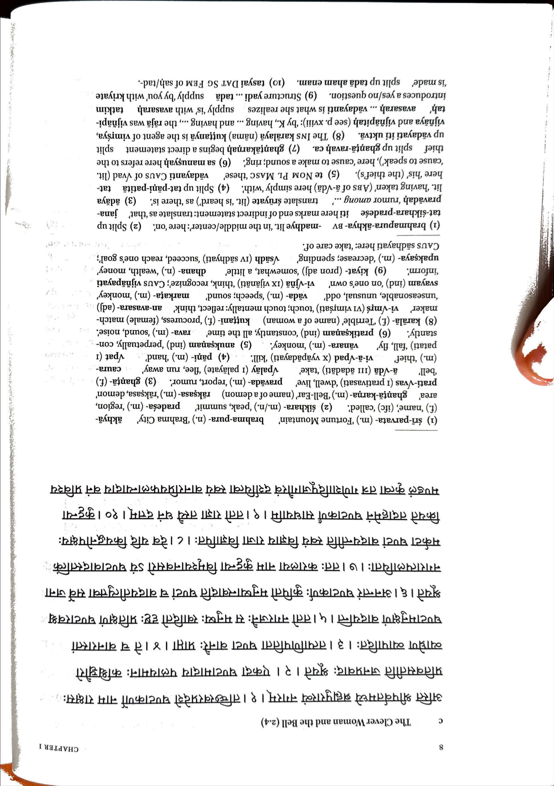 (1)brahmapura-akhya- bv -madhyelit.‘inthemiddle/center’:here‘on’. (2)Splitup tat-sikhara-pradese itiheremarksendofindirectstatement:translateas‘that’ janapravadah‘rumoramong...’ translateriiyate(lit.‘isheard’)as'thereis’. (3)adaya lit.‘havingtaken’(Absofa-Vda)heresimply‘with’. (4)Splituptat-pani-patita tathere‘his’(thethiefs). (5)teNomPlMasc‘these’ vadayantiCausofVvad(lit. ‘causetospeak*),here‘causetomakeasound;ring’. (6)samanusyahherereferstothe thief splitupghanta-ravahca. (7)ghantakarnahbeginsadirectstatement split upvadayatiitiuktva. (8)TheInskaralaya(nama)kuttanyaistheagentofvimrsya, vijnayaandvijnapitah (seep.xviii):‘byK.,having andhaving...,therajawasvijnapitah' avasarah...vadayantiiswhatsherealizes supply‘is’withavasarah tatkim introducesayes/noquestion. (9)Structureyadi...tada supply'byyou1withkriyate ‘ismade' splituptadaahamenam. (10)tasyaiDatSgFemofsah/tad-.