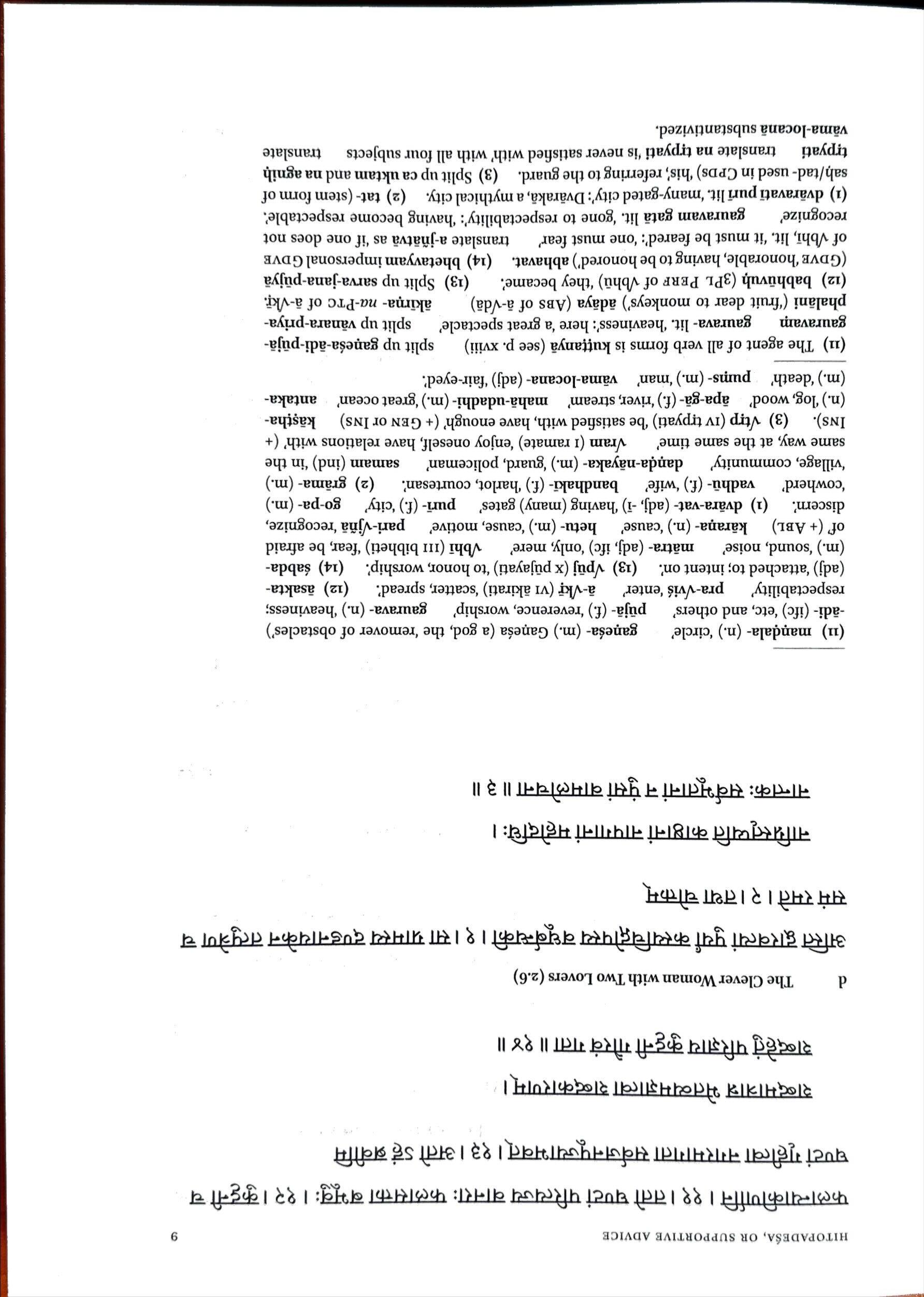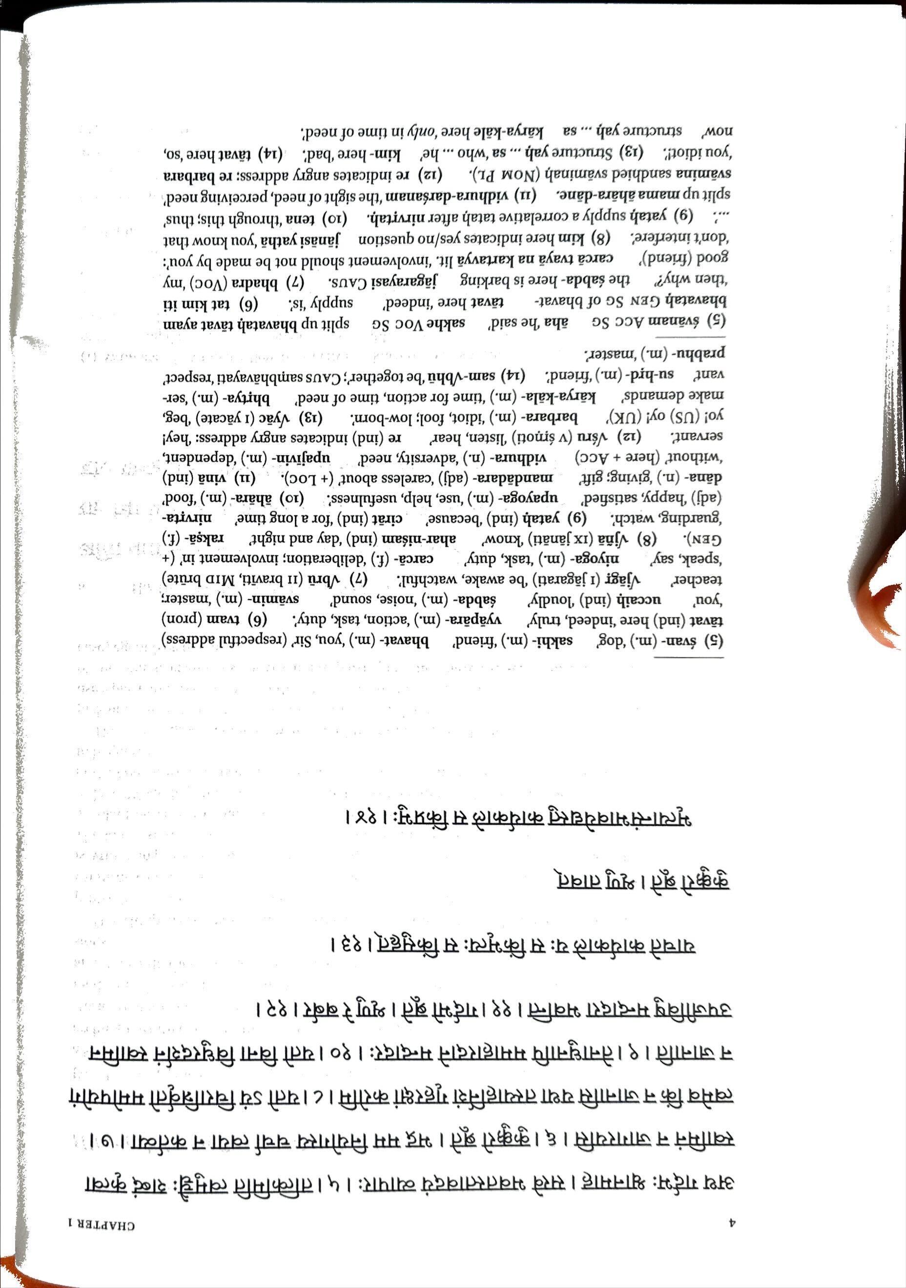 (5)svan-(m.)‘dog’ sakhi-(m.)‘friend’ bhavat-(m.)‘you,Sir’(respectfuladdress) tavat(ind)here‘indeed,truly’ vyapara-(m.)‘action,task,duty’. (6)tvam(pron) ‘you’ uccaih(ind)‘loudly’ sabda-(m.)‘noise,sound’ svamin-(m.)‘master; teacher’ VjagT(rjagarati)‘beawake,watchful’. (7)Vbru(11braviti,Midbrute) ‘speak,say’ niyoga-(m.)‘task,duty’ carca-(f.)‘deliberation;involvementin’(+ Gen). (8)vjna(ixjanati)‘know’ ahar-nisam (ind)‘dayandnight’ raksa-(f.) ‘guarding,watch’. (9)yatah(ind)‘because’ cirat(ind)‘foralongtime’ nirvrta(adj)‘happy,satisfied’ upayoga-(m.)‘use,help,usefulness’. (10)ahara-(m.)‘food’ dana-(n.)‘giving;gift’ mandadara-(adj)‘carelessabout’(+Loc). (11)vina(ind) ‘without’(here+Acc) vidhura-(n.)‘adversity,need’ upajivin-(m.)‘dependent, servant. (12)Vsru(vsmoti)‘listen,hear’ re(ind)indicatesangryaddress:‘hey! yo!(US)oy!(UK)’ barbara- (m.)‘idiot,fool;low-born’. (13)Vyac(1yacate)‘beg, makedemands’ karya-kala-(m.)‘timeforaction,timeofneed’ bhrtya-(m.)‘servant su-hrd-(m.)‘friend’. (14)sam-Vbhu‘betogether’;Caussambhavayati‘respect’ prabhu-(m.)‘mastet.