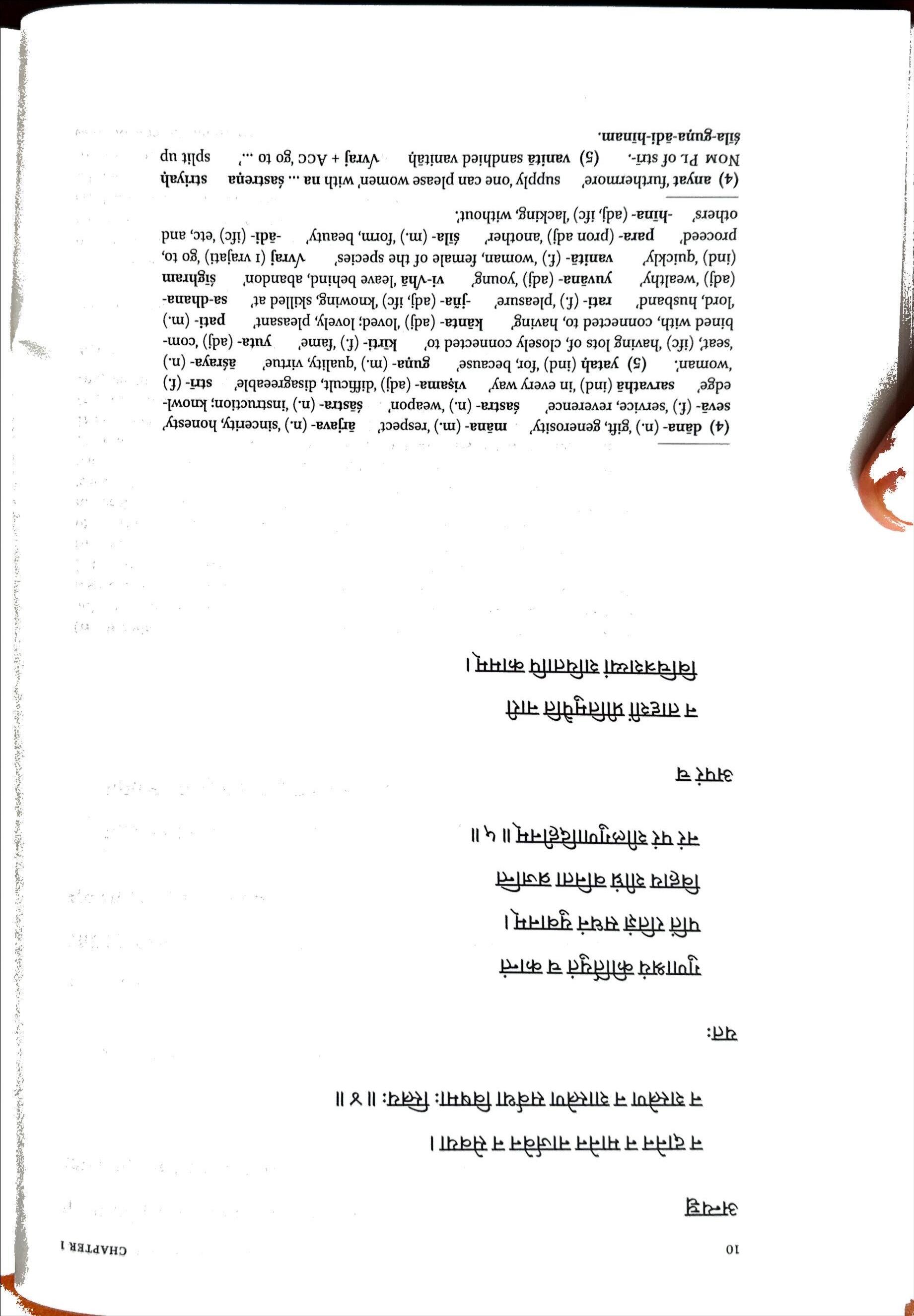 (4)dana-(n.)‘gift,generosity’ mana-(m.)‘respect’ arjava-(n.)‘sincerity,honesty’ seva-(f.)‘service,reverence’ sastra-(n.)‘weapon’ sastra-(n.)‘instruction;knowledge’ sarvatha(ind)‘ineveryway’ visama-(adj)‘difficult,disagreeable’ stri-(f.) ‘woman’. (5)yatah(ind)‘for,because’ guna-(m.)‘quality,virtue’ asraya-(n.) ‘seat’,(ifc)‘havinglotsof,closelyconnectedto’ kirti-(f.)‘fame’ yuta-(adj)‘combinedwith,connectedto,having* kanta-(adj)‘loved;lovely,pleasant’ pati-(m.) ‘lord,husband* rati-(f.)‘pleasure’ -jna-(adj,ifc)‘knowing,skilledat’ sa-dhana(adj)‘wealthy’ yuvana-(adj)‘young’ vi-Vha‘leavebehind,abandon’ sighram (ind)‘quick!/ vanita-(f.)‘woman,femaleofthespecies’ Vvraj(1vrajati)‘goto, proceed’ para-(pronadj)‘another’ £ila-(m.)‘form,beauty’ -adi-(ifc)‘etc,and others* -hina-(adj,ifc)‘lacking,without’.