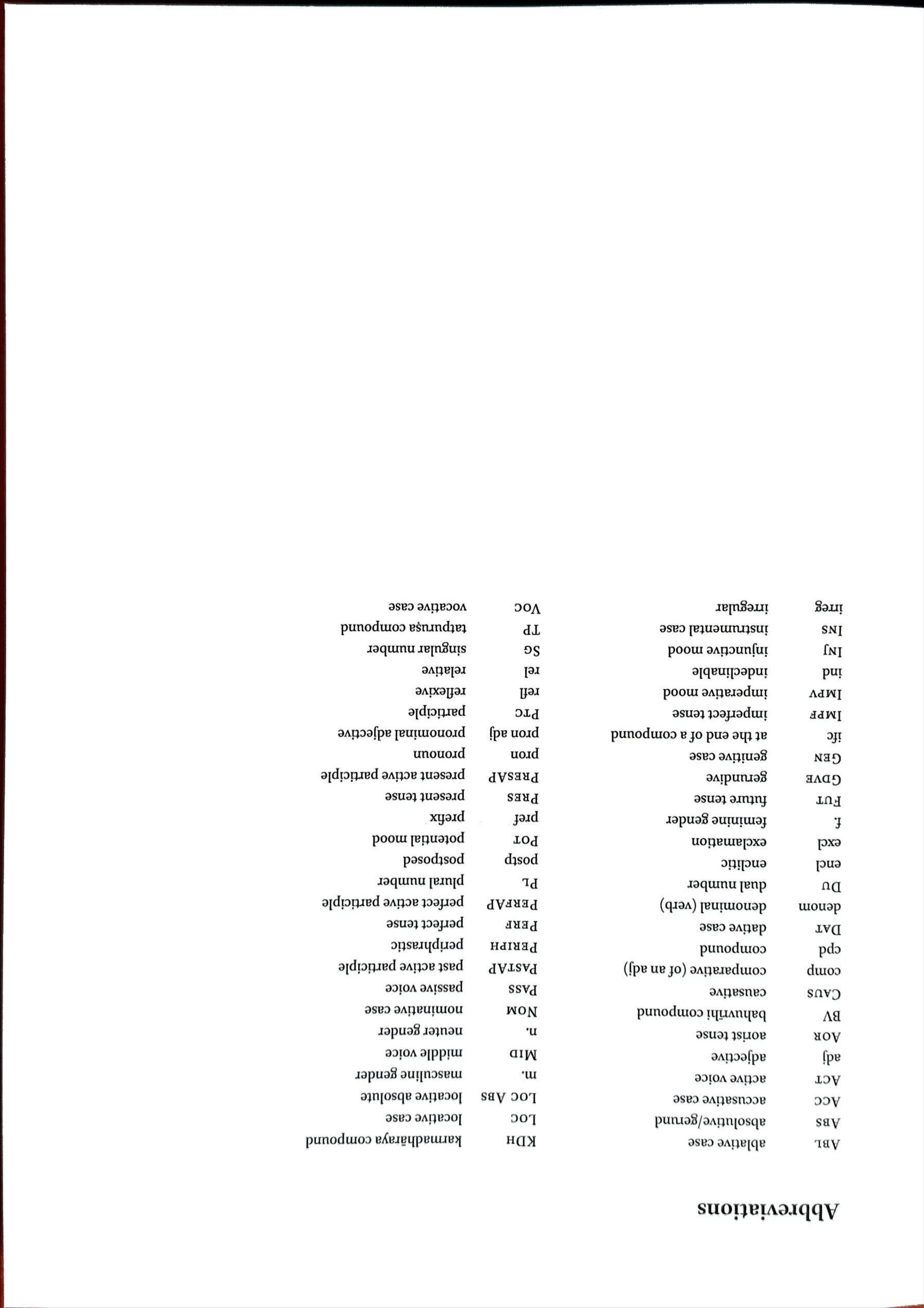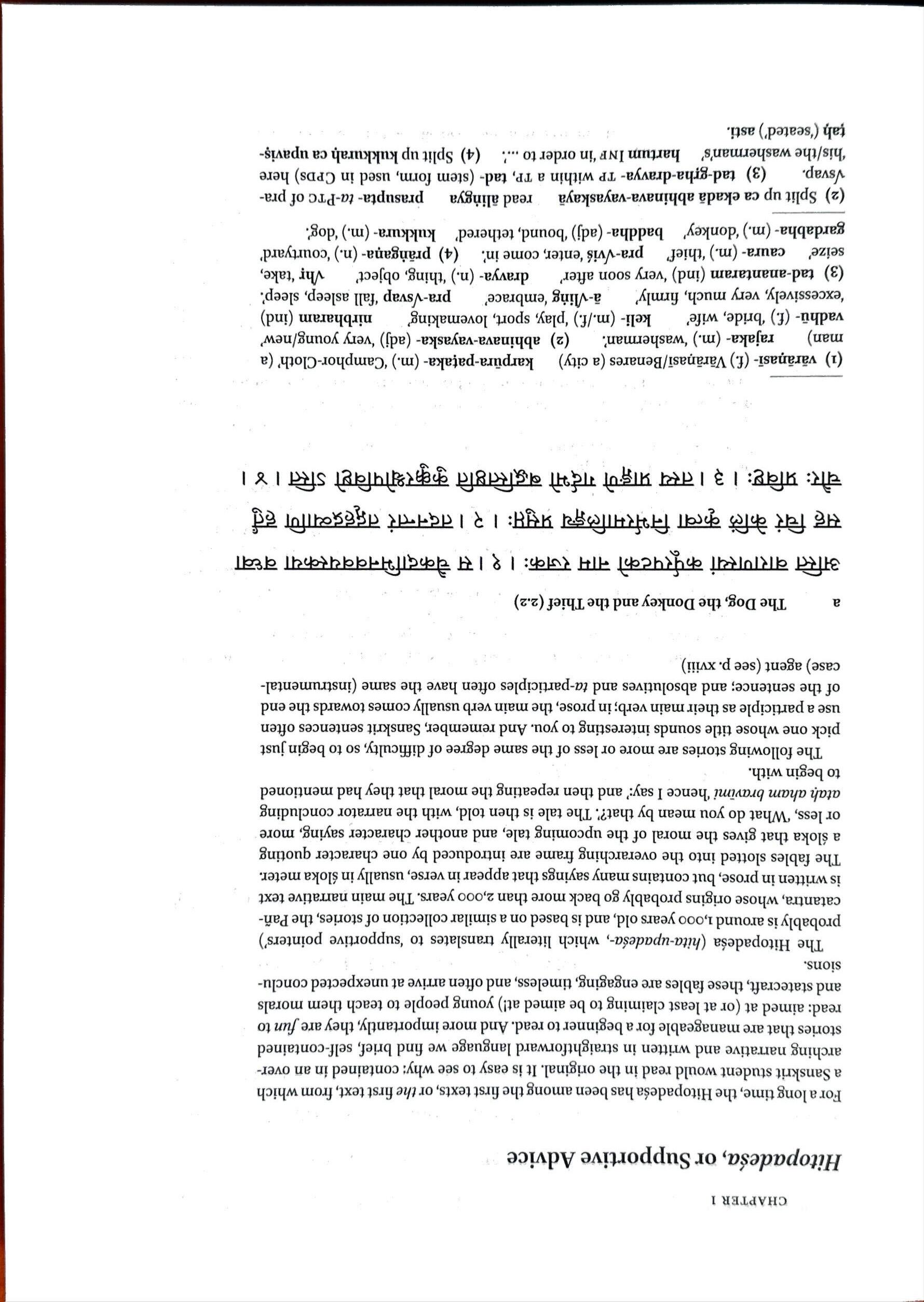 (1)varanasi- (f.)Varanasi/Benares(acity) karpura-pataka-(m.)‘Camphor-Cloth’(a man) rajaka-(m.)‘washerman’. (2)abhinava-vayaska-(adj)‘veryyoung/new’ vadhu-(f.)‘bride,wife’ keli-(m./f.)‘play,sport,lovemaking’ nirbharam(ind) 'excessively,verymuch,firmly’ a-Vling‘embrace’ pra-Vsvap‘fallasleep,sleep’. (3) tad-anantaram(ind)‘verysoonafter’ dravya-(n.)‘thing,object’ Vhr‘take, seize’ caura-(m.)‘thief pra-Vvis‘enter,comein’. (4)prangana-(n.)‘courtyard’ gardabha-(m.)‘donkey’ baddha-(adj)‘bound,tethered’ kukkura-(m.)‘dog’.