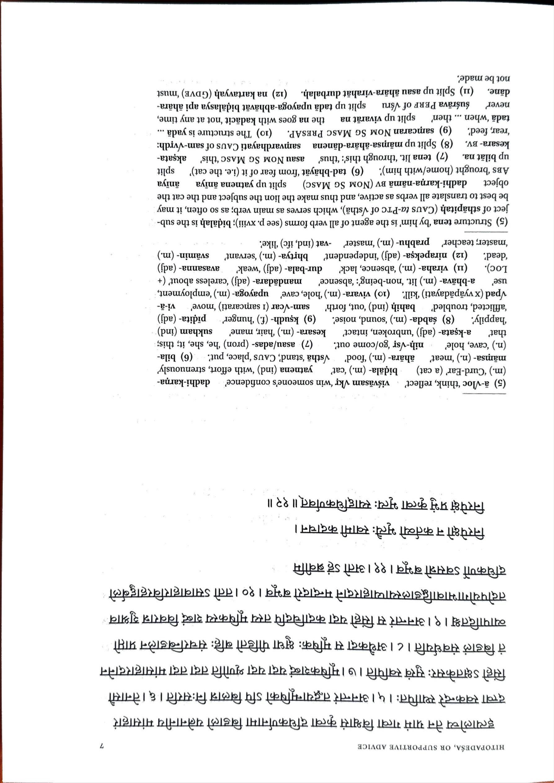 (5)a-Vloc‘think,reflect’ visvasamVkr‘winsomeone’sconfidence’ dadhi-karna(m.)‘Curd-Ear’(acat) bidala-(m.)‘cat’ yatnena(ind)‘witheffort,strenuously’ mamsa- (n.)‘meat’ ahara-(m.)‘food’ Vstha‘stand’,Caus‘place,put’. (6)bila(n.)‘cave,hole’ nih-Vsr‘go/comeout’. (7)asau/adas-(pron)‘he,she,it;this; that’ a-ksata- (adj)‘unbroken,intact’ kesara-(m.)‘hair,mane’ sukham(ind) ‘happily’. (8)sabda-(m.)‘sound,noise’. (9)ksudh-(f.)‘hunger’ pidita- (adj) ‘afflicted,troubled’ bahih (ind)‘out,forth’ sam-Vcar(1samcarati)‘move’ vi-aVpad(xvyapadayati)‘kill’. (10)vivara-(m.)‘hole,cave’ upayoga-(m.)‘employment, use’ a-bhava- (m.)lit.‘non-being’:‘absence’ mandadara-(adj)‘carelessabout’(+ Loc). (11)viraha-(m.)‘absence,lack’ dur-bala-(adj)‘weak’ avasanna- (adj) ‘dead’. (12)nirapeksa-(adj)‘independent’ bhrtya-(m.)‘servant’ svamin-(m.) ‘master;teacher’ prabhu-(m.)‘master’ -vat(ind,ife)‘like’.