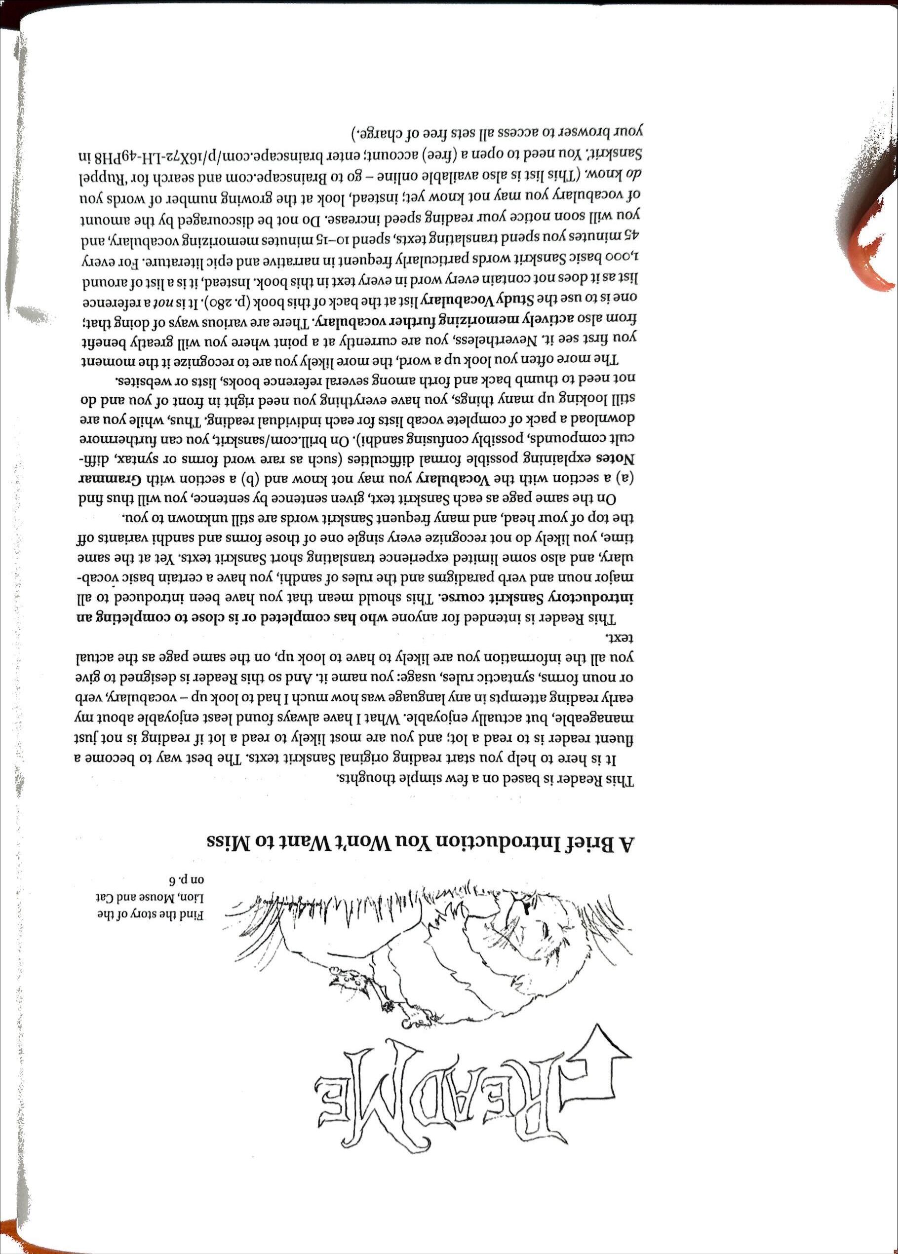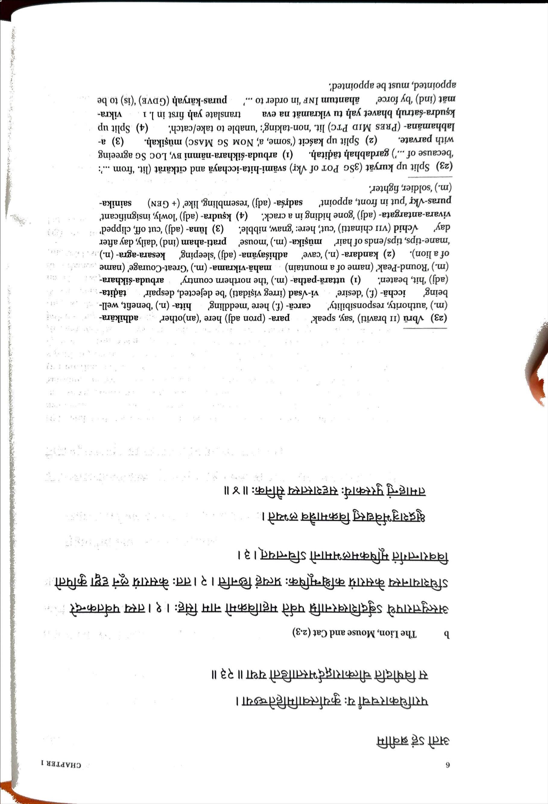 (23)Vbru(11braviti)‘say,speak’ para-(pronadj)here‘(an)other’ adhikara(m.)‘authority,responsibility’ carca-(f.)here‘meddling’ hita-(n.)‘benefit,wellbeing’ iccha-(f.)‘desire’ vi-Vsad(irregvisldati)‘bedejected,despair’ tadita(adj)‘hit,beaten'. (i)uttara-patha-(m.)‘thenortherncountry’ arbuda-sikhara(m.)‘Round-Peak’(nameofamountain) maha-vikrama- (m.)‘Great-Courage’(name ofalion). (2)kandara-(n.)‘cave’ adhiayana-(adj)‘sleeping’ kesara-agra-(n.) 'mane-tips,tips/endsofhair’ musika-(m.)‘mouse’ prati-aham (ind)‘daily,dayafter day’ Vchid(vnchinatti)‘cut’,here:'gnaw,nibble’. (3)luna-(adj)‘cutoff,clipped’ vivara-antargata- (adj)‘gonehidinginacrack’. (4)ksudra-(adj)‘lowly,insignificant’ puras-Vkr‘putinfront,appoint' sadrsa-(adj)‘resembling,like’(+Gen) sainika(m.)‘soldier,fighter’.