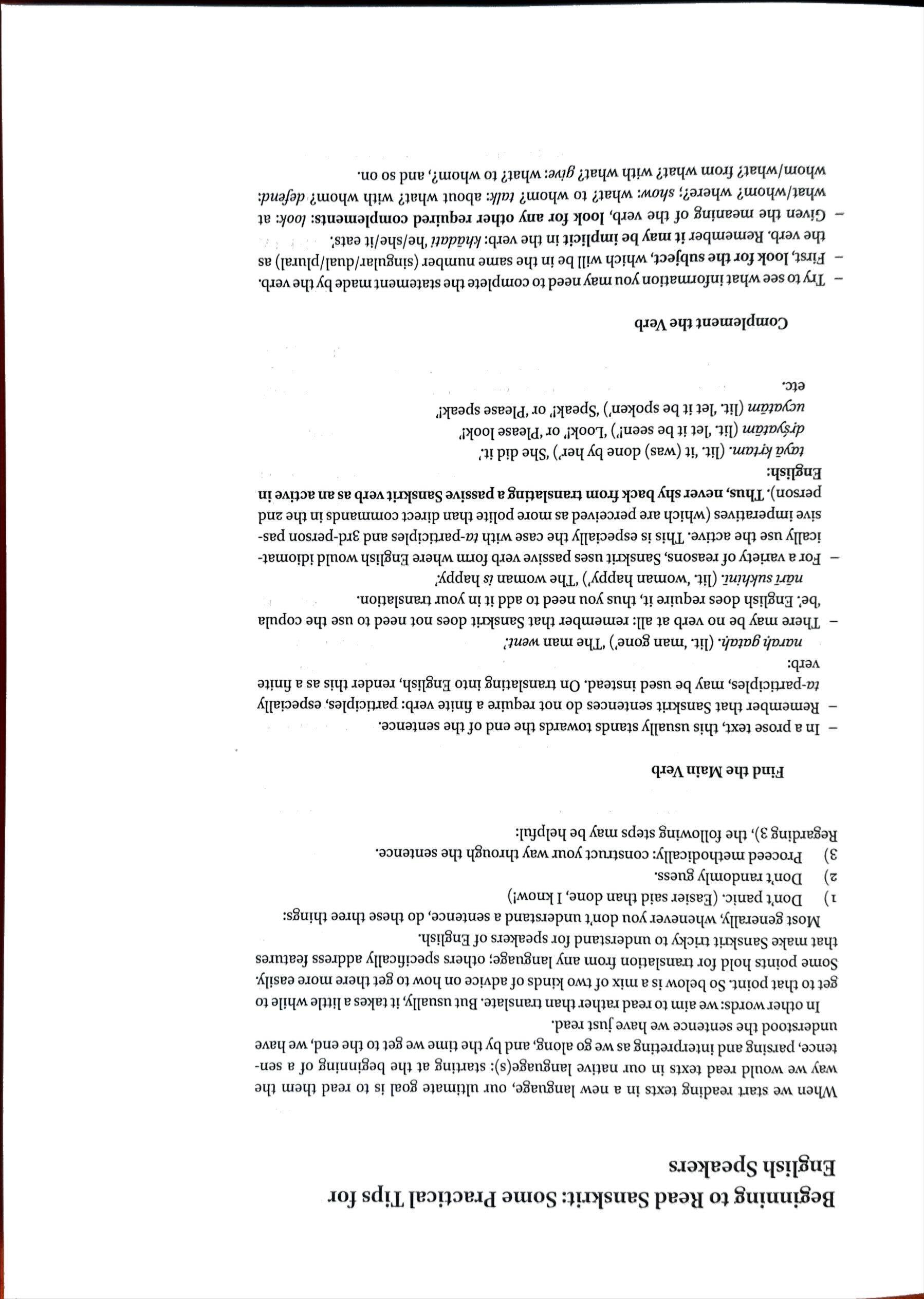 (5)Structuretena‘byhim’istheagentofallverbforms(seep.xviii);bidalahisthesubjectofsthapitah(Causta-PTCofVstha),whichservesasmainverb;assooften,itmay bebesttotranslateallverbsasactive,andthusmakethelionthesubjectandthecatthe object dadhi-karna-namabv(NomSgMasc) splitupyatnenaaniya anlya Abs‘brought(home/withhim)’. (6)tad-bhayat‘fromfearofit(i.e.thecat)’ split upbilatna. (7)tenalit.‘throughthis’:‘thus’ asauNomSgMasc‘this’ aksatakesara-bv. (8)Splitupmamsa-ahara-danena samvardhayatiCausofsam-Vvrdh: ‘rear,feed’. (9)samcaranNomSgMascPresAP. (10)Thestructureisyada tada‘when then’ splitupvivaratna thenagoeswithkadacit‘notatanytime, never’ 6u4ravaPerfofV&ru splituptadaupayoga-abhavatbidalasyaapiahara* dane. (11)Splitupasauahara-virahatdurbalah. (12)nakartavyah(Gdve)‘must notbemade’.