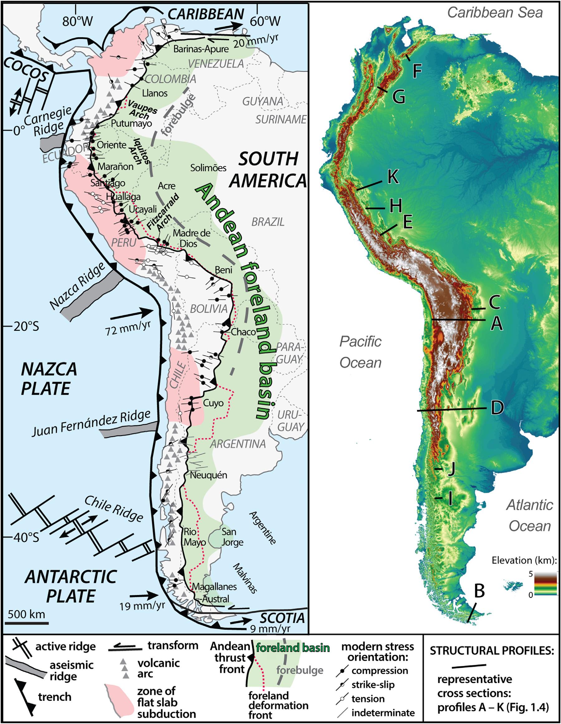 ThemodernplatetectonicconfigurationofwesternSouthAmerica(Fig.1.1)involvesanocean-continentconvergentplate boundarywithasubductionzonedefinedbytheeast-dippingoceanicNazcaslab.Thetrench-parallelAndeanmagmaticarc iscomposedoffourdiscontinuoussegments(thenorthern,central,southern,andaustralvolcaniczones)dividedby separateregionsoflateCenozoic flat-slabsubductionorslab-windowgeneration,includingtheColombian/Bucuramanga flatslab(2 8 N),Peruvian flatslab(5 15 S),Chilean/Pampean fl atslab(27 33 S),andthePatagonianslabwindow adjacenttotheNazca-Antarcticaspreadingridge(45 48 S)(BarazangiandIsacks,1976; Jordanetal.,1983; Ramos, 1999; BreitsprecherandThorkelson,2008; RamosandFolguera,2009; Wagneretal.,2017).TheAndesMountainsforma continuoustopographicbarrierthatistheproductofretroarccrustalthickeningdrivenbyhorizontalshorteningina compressionaltectonicregime.Thisshorteninghasbeenaccommodatedintheretroarcfold-thrustbeltbyprincipallydipslipcontractionalstructures,asreflectedinearthquakefocalmechanismsandmodernstressmeasurements (e.g., Assumpçãoetal.,2016).Manythrust-beltstructuresaregeometricallyandkinematicallylinkedtoamiddletoupper crustaldécollementthatisconsideredtounderlietheentireAndeanorogenicbelt(Babyetal.,1997; McQuarrie,2002a; Giambiagietal.,2012, 2015).