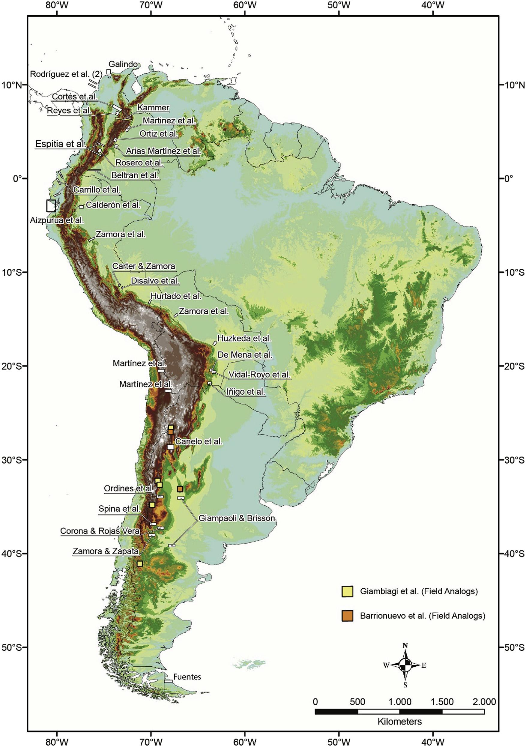 To firstorder,theentireAndeanmarginhasexperiencedaremarkablysimilarplatetectonichistoryoverthepast w120 Myr,withSouthAmericabreakingawayfromAfricaandadvancinguniformlywestwardwithminimaltectonicrotation andnegligiblelatitudinalvariation(Silveretal.,1998; SomozaandGhidella,2012).Despitethissharedhistory,the westernedgeofSouthAmericadisplayssharpchangesintopography(includingtheaverageorogenicelevationand width),magnitudeofdeformation(withvariedlow-,moderate-,andhigh-shorteningregimes),andaremarkablydiverse arrayofstructuralstyles(Kleyetal.,1999; Jacques,2003; Ramosetal.,2004; MacellariandHermoza,2009; Ramos, 2009; Moraetal.,2010a; Giambiagietal.,2012; Horton,2018a; McClayetal.,2018; Zamoraetal.,2019).