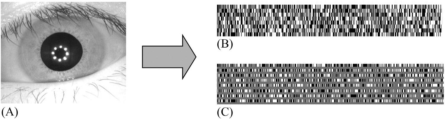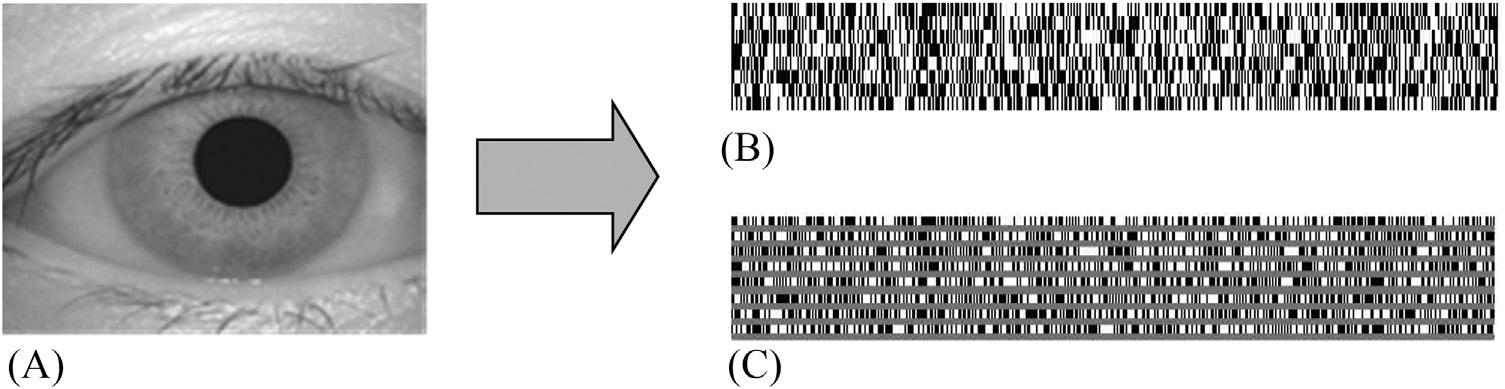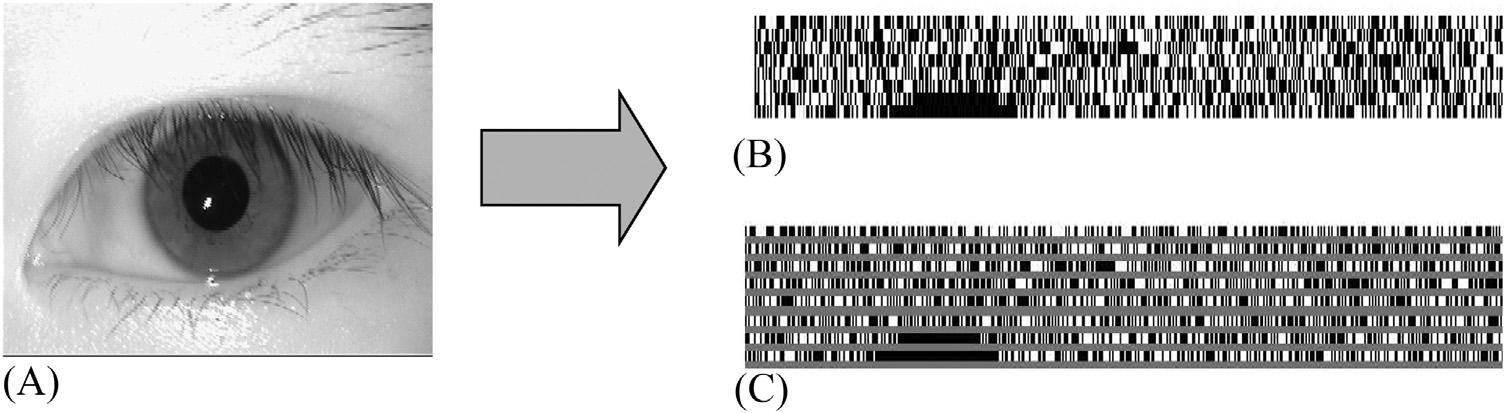 FIGURE1.9 (A)Anoriginaliris imagefromtheCASIA-IRIS-V4 dataset [33],(B)thefinalgeneratediristemplate,and(C)alarger viewofthebinarizedtemplate.