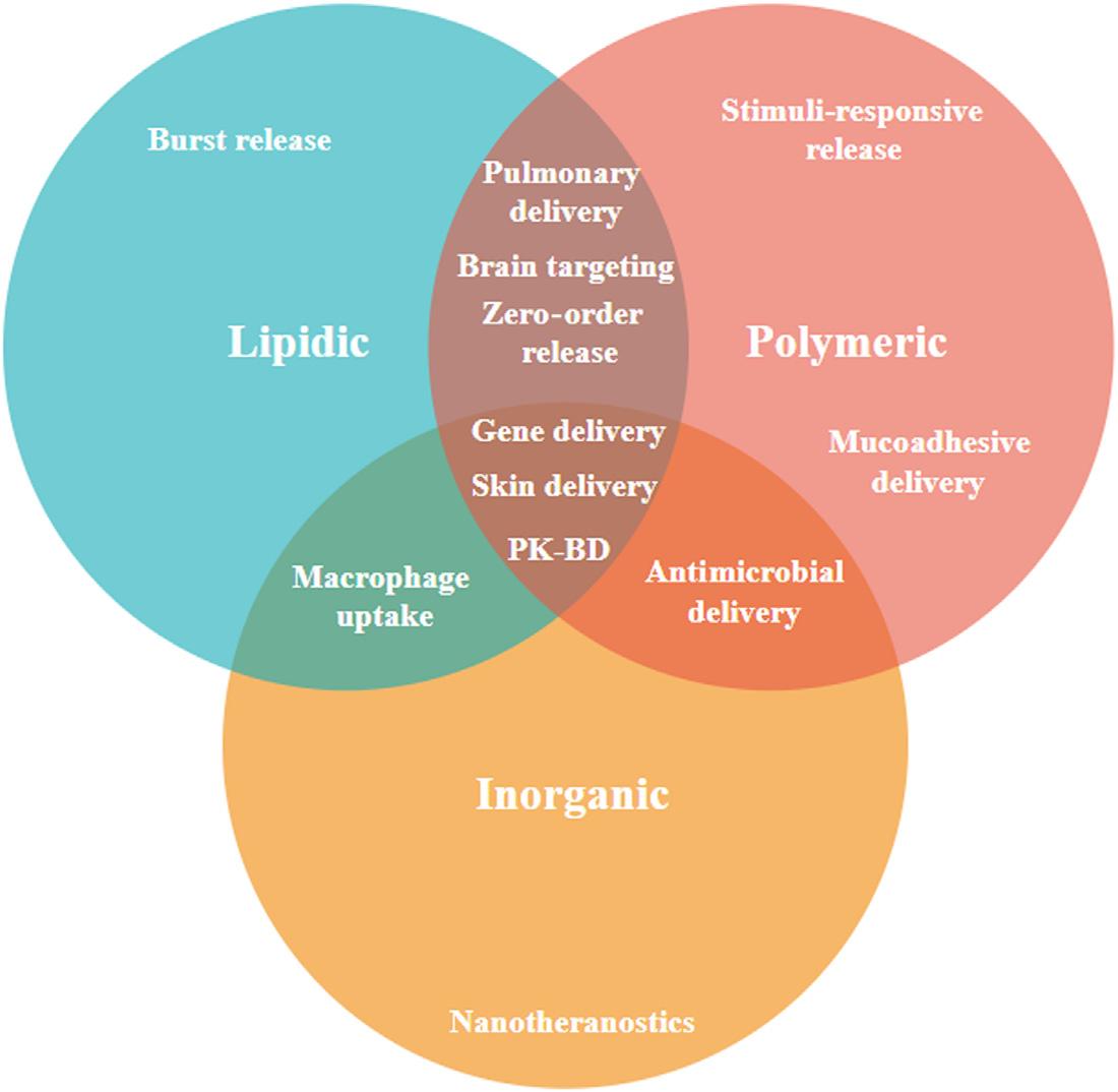 Outofaplethoraofnanotherapeuticstrategies,certaintypesofnanoparticlesaresuitableforcertainapplications.Asisshownin Fig.1.2,lipidicnanoparticlesaresuitableforaburstreleaseprofile,whichpromotestherapid onsetandsustaineddurationofaction.Polymericnanoparticlesarebestsuited forstimuli-responsivereleaseandmucoadhesivedelivery.Inorganicnanoparticlesarebestsuitedfortheranosticapplications.Theirapplicationsfurther encompassotherapplications,suchasbrainandpulmonarydelivery,inwhich lipidandpolymericsystemsareappropriate;antimicrobialdelivery,inwhich polymericandinorganicsystemsaresuitable;andmacrophageuptake,in whichlipidandinorganicnanoparticlesareapplicable.