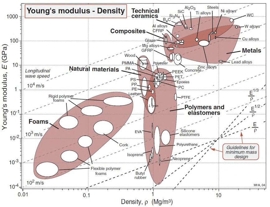 FIG.1.1 Ashby’smaterialselectionchartofYoung’smodulusasafunctionofdensityforthe majorclassesofmaterialsincludingpolymersandelastomers [1]