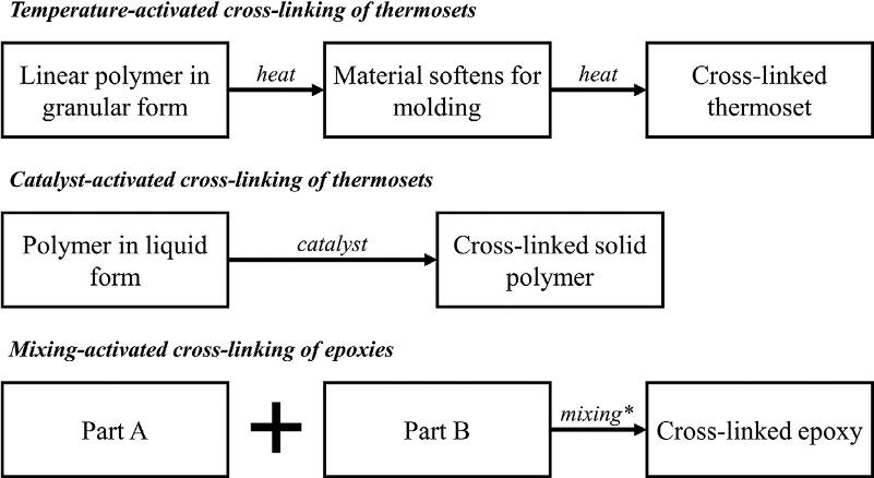 Forthermosetpolymers,theprocessofcovalentlybondingmonomers togethertocreateathree-dimensionalnetworkiscalledcross-linking,which iscommonlyreferredtoasthecuringprocessofthermosets.Inotherwords, thestagesofprocessingthermosetsarecuring,setting,andhardening.That is,whensomeoneissaying:“waitingforthepolymertodry,”thispersonisactuallyreferringtothetimerequiredtoreachthehardeningstage,wherethepolymeris“dry”ordoesnotexhibittackiness.Thecross-linkingofthermosetscan bedividedintothreecategories:temperature-activated,catalyst-activated,and mixing-activated(orkinetically-activated).Thedifferencebetweenandthe detailofeachofthecross-linkingcategoriesisshownschematicallyin Fig.1.6.Itisworthnotingthatthecrossinglinkingprocessofrubbersisusually termed vulcanization.