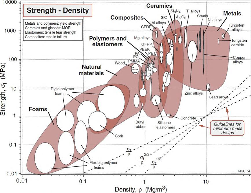 Incomparisontothepropertiesofmetalsandceramics(see [1,2] tobenchmark theproperties),unreinforced,commonengineeringpolymershaveanelastic modulusthatcanrangefromafewkPatolessthan10GPa,afailurestrength between10and100MPa,andlowthermalconductivityintheorderof0.1W/m. K [1].However,thedensityofpolymersissubstantiallylowerthanotherclasses ofmaterialsandaveragesaround1000kg/m3.Therefore,theutilityofpolymers inengineering,load-bearingapplicationsissubstantiatedbasedonthespecificproperty(i.e.,propertyperunitdensity)asexplicatedbyAshby’sselectionplots shownin Figs.1.1and1.2,whereYoung’smodulusvs.densityandthefailure strengthasafunctionofdensityaredefined,respectively [1].Collectively, polymerscanbeselectedandtakenintoconsiderationtomeetcertaindesign requirements(definedbythedotteddesignlinesonAshby’splotsbasedon