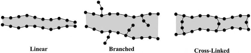 Polymersmayalsobeclassifiedbasedontheorderoftheirmolecularstructure,dependingonthedegreeofcrystallinity.Asmentionedearlier,polymers arecompoundsoflong-chainmoleculesconsistingofrepeatingunits(mersor monomers),wherethechainisalongstringofcovalentlybondedcarbonatoms. Thesynthesisprocessofjoiningmonomerstocreatethemacromoleculeis calledpolymerization.Therefore,thedegreeofpolymerizationreferstothe numberofmonomerunitsinachain.Theresultingmolecularstructurecanthen bedividedinto(1)linearstructure(chain-likestructure, Fig.1.4A),(2)branched structure(chain-likewithsidebranches, Fig.1.4B),and(3)cross-linkedstructure(connectedbranchedchains, Fig.1.4C).Thearrangementofthechainsfor oneanotheriswhatwebasethisparadigmofclassificationon.