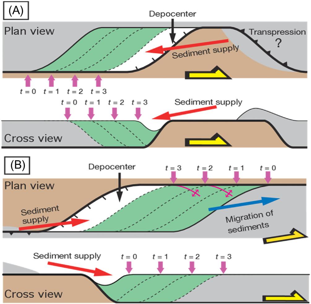 FIGURE1.4 Conceptualmodelsfordepocenter migrationandaxialsedimentsupplyinfault-bend basins.(A)Progressiveright-lateralmigrationof pairedbendsonthefootwallgeneratescompressionalupliftandextensionaldepressiononthe hangingwall.Sedimentsarealwayssuppliedfrom thesamedirectionalongthelong-axisofthebasin. (B)Depocenterfixesalongthereleasingbendresult fromtheright-lateralmigrationofsedimentsdepositedonthefootwall.Atranspressionalcomponent wouldberequiredtogeneratethesedimentsource, andene ´ chelonfoldsmayformalongthemaster faults.Bothmodelsgeneratedepositswithaxial sedimentswhosethicknessesaregreaterthanthe burialdepths.Source:Reproducedwithpermission fromAtsushiNoda.