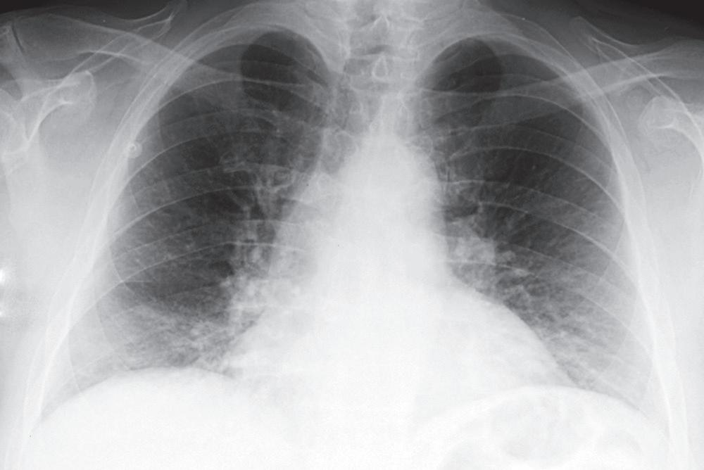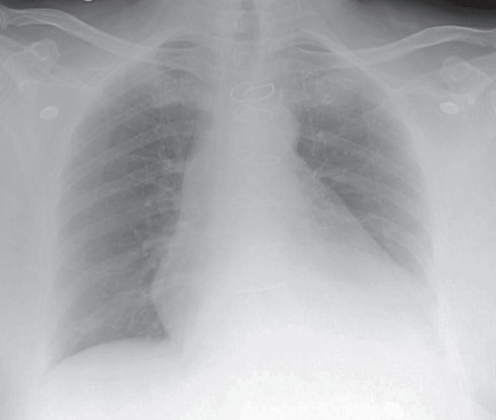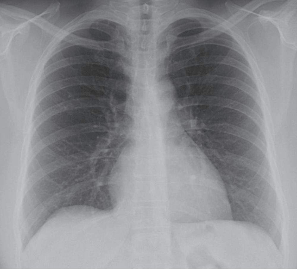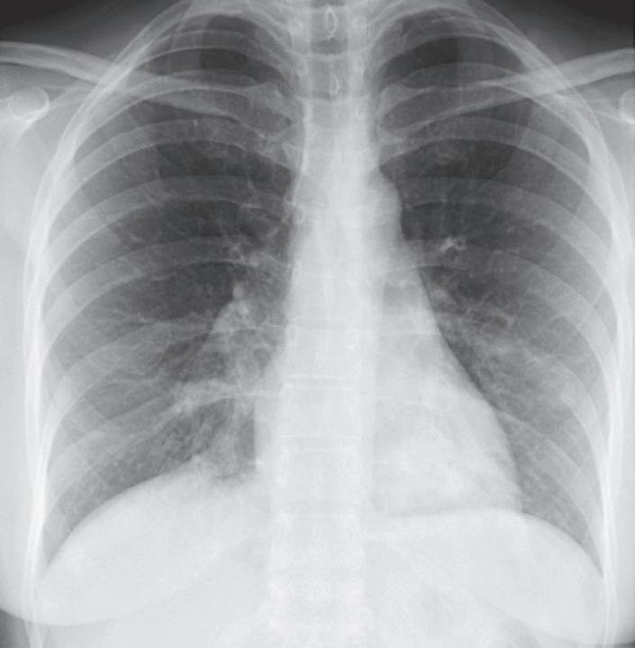 « Cas de disparition du cœur ». Radiographie du thorax manifestement anormale chez une femme de 43 ans opérée 2 ans auparavant pour un carcinome bronchogénique. Pourquoi n'est-il pas possible de voir le cœur ? Il n'a évidemment pas été enlevé à l'intervention ! Réponse à la fin de l'ouvrage.