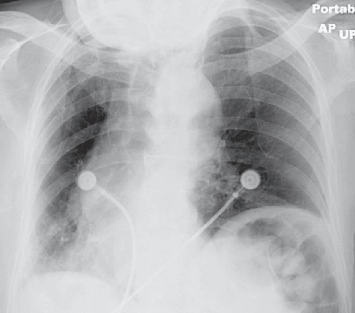 Le cliché du thorax en lordose apicale est le plus souvent réalisé involontairement avec l'appareil mobile chez des patients alités en position semicouchée. Noter que les clavicules sont projetées au-dessus des premières côtes, et que leur forme en « S » devient à présent rectiligne (flèches blanches). L'image en lordose altère aussi la forme du cœur, et produit un faux effacement de l'hémidiaphragme gauche (flèche noire). La connaissance de ces artéfacts évite la confusion avec des pathologies qui n'existent pas.