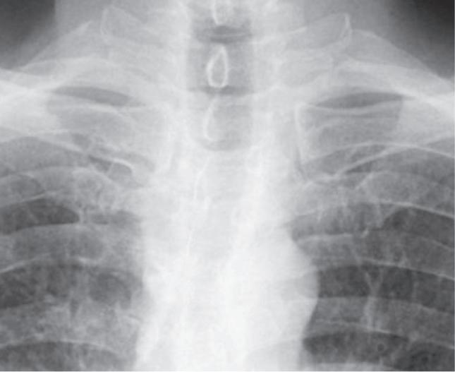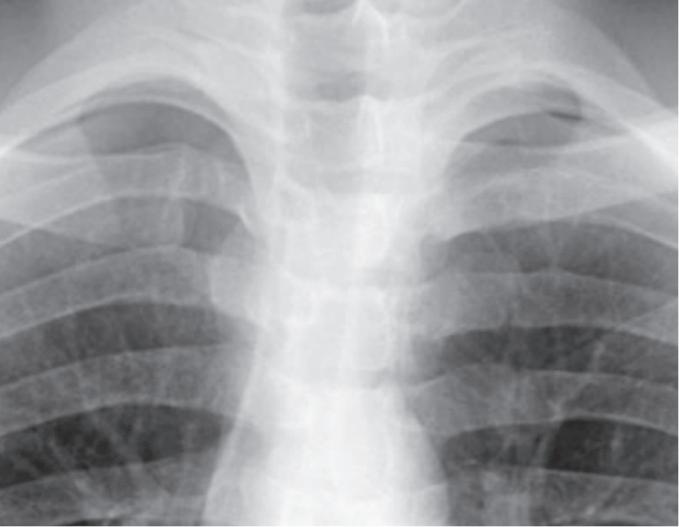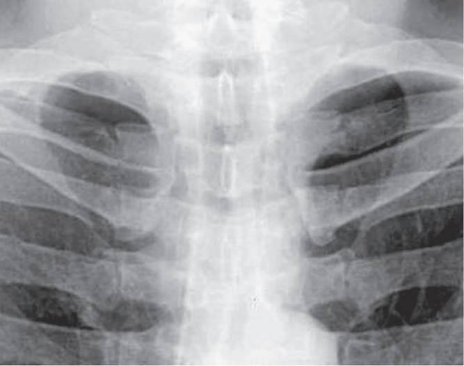 • Trop forte inclinaison. Vous pouvez reconnaître l'image du thorax de face en lordose apicale lorsque les clavicules se projettent au niveau ou au-dessus des premières côtes. Il y a également une distorsion des clavicules en redressant la configuration normale en « S » (fig. 2.11). Pour éviter ce piège, sachez reconnaître l'erreur technique et la distorsion anatomique qu'elle entraîne. Pour les images prêtant à confusion, discutez avec un radiologue.