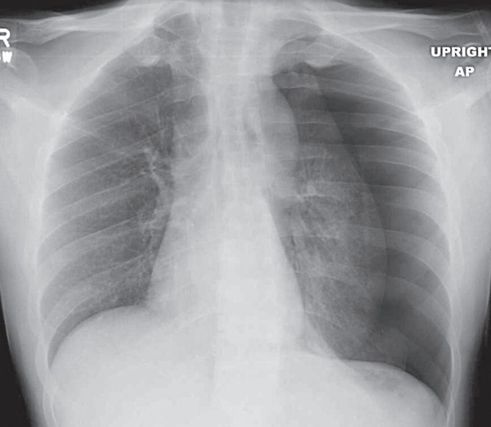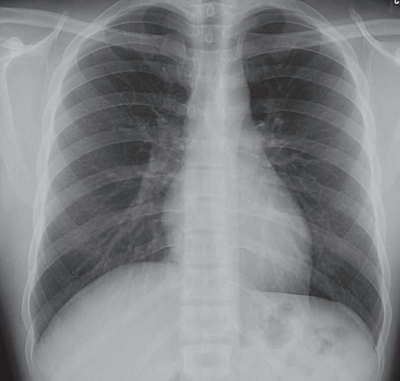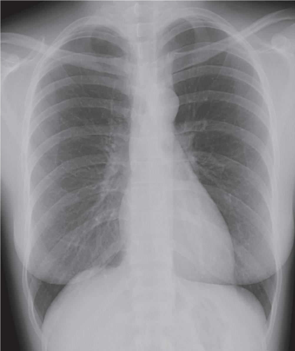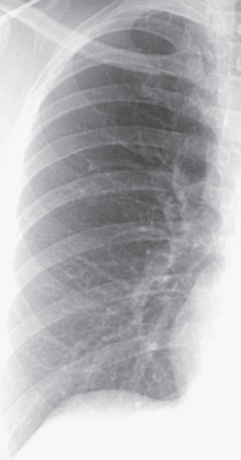 Patient de 24 ans vu aux urgences suite à une intense douleur thoracique gauche avec dyspnée. Cette radiographie conventionnelle du thorax montre une importante anomalie immédiatement apparente. Sauriez-vous la reconnaître ? Réponse à la fin de l'ouvrage.