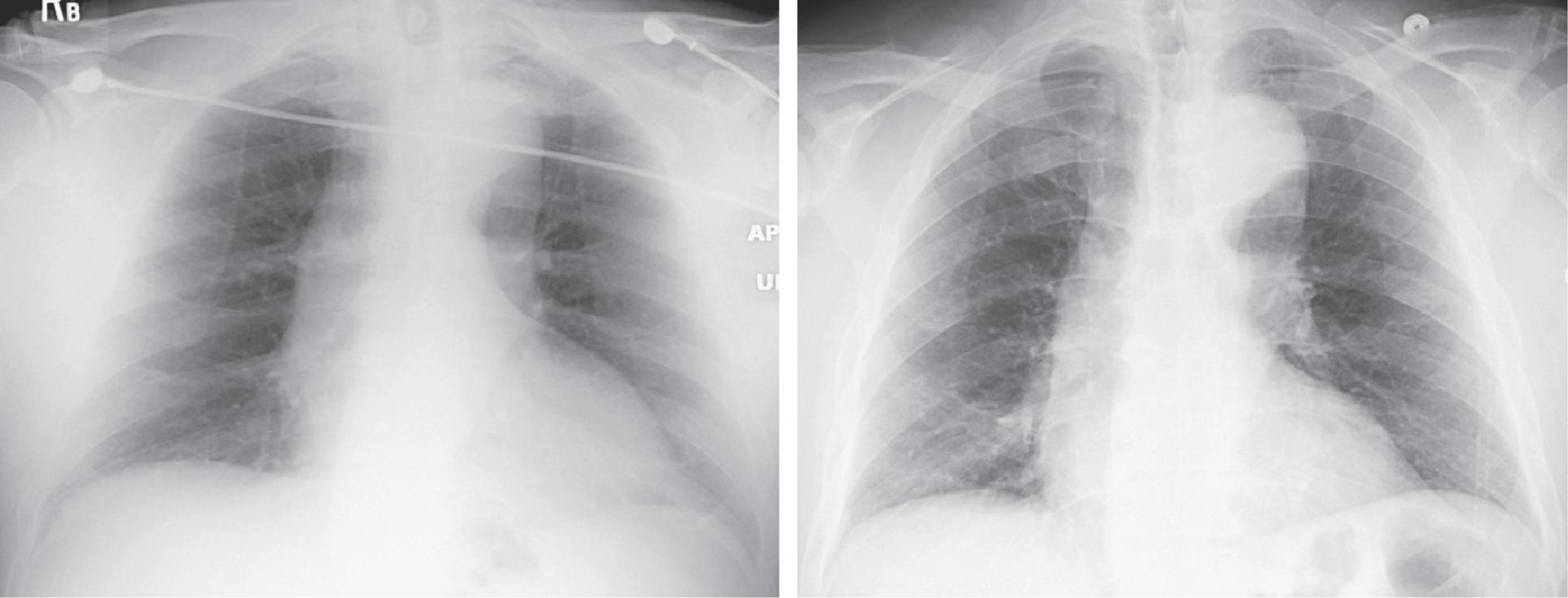 A.Radiographie du thorax de face en AP : le cœur apparaît un peu plus grand qu'en B qui représente le même patient en PA quelques minutes plus tard. En pratique, il n'y a qu'une très faible différence de taille du cœur en AP et PA, à condition que le patient effectue la même inspiration. Le cœur apparaîtra aussi plus grand sur une radiographie pratiquée en AP au lit avec un appareil mobile, la distance entre le tube à rayons X et le patient étant plus courte (1 mètre) qu'en radiographie standard debout en PA (1,80 mètre). Plus la distance entre le foyer de rayons X et le patient est grande, moins il y a d'agrandissement.