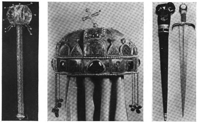 closed and weighted down by the occupant of the carriage, the cross got bent. The Hungarian coronation regalia included three other pieces: a sword, an orb, and a scepter The scepter was extremely beautiful. The stalk was of rich gold filigree and terminated in a spherical ornament of carved rock crystal. The regalia was kept in a specially constructed iron trunk with three locks, the keys to which were entrusted to three different nobles. At the close of the present war, American troops apprehended a Hungarian officer with the trunk. Perhaps he was trying to safeguard the regalia as his predecessor in the sixteenth century had done. In any case, the American authorities thought they’d better relieve him of that grave responsibility
