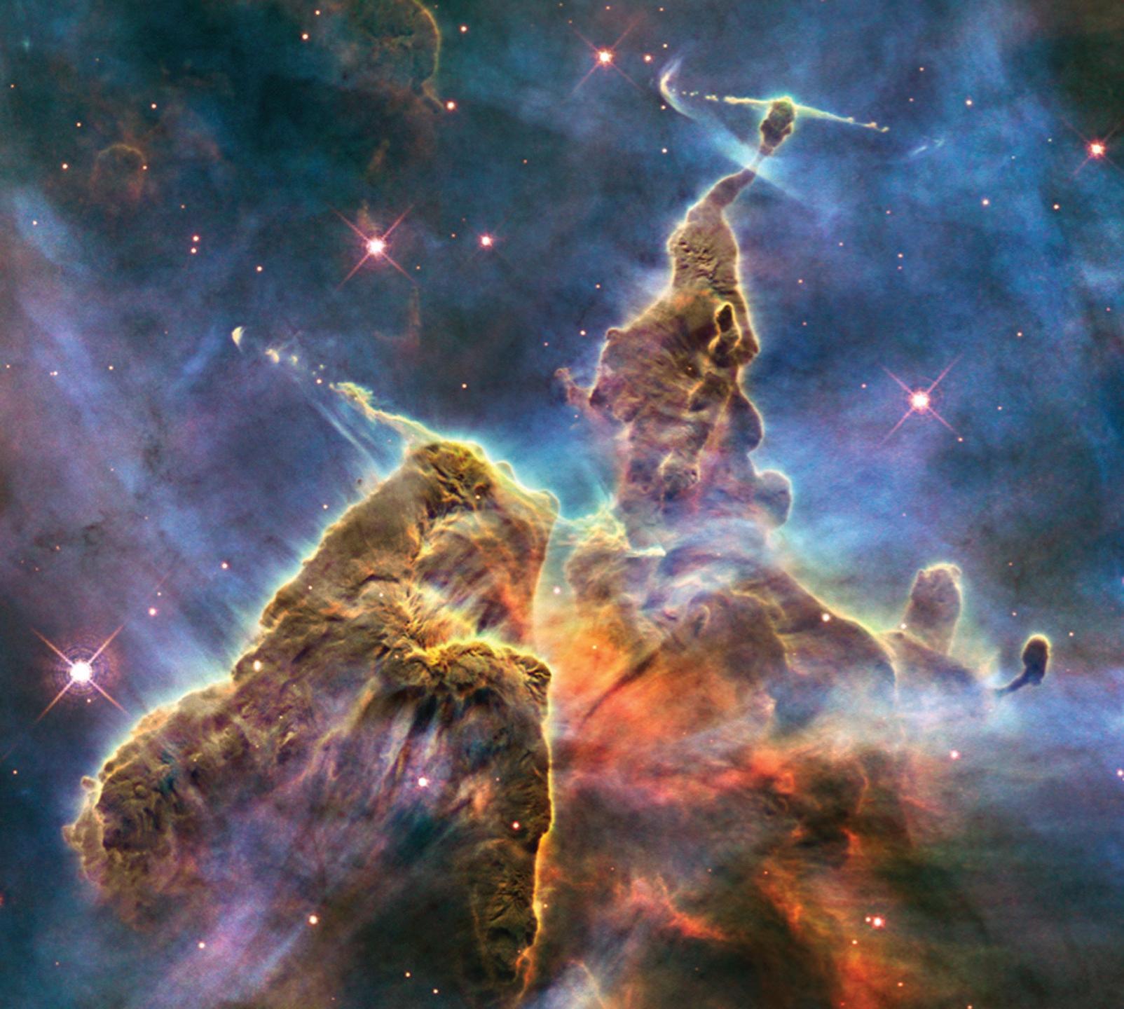 Plate 4.1. A molecular cloud in the Carina star-forming region of our galaxy. New stars light up the interior of the cloud; the characteristic jets flowing from the poles of a young rotating star can be seen in the upper right. Credit: NASA Hubble image