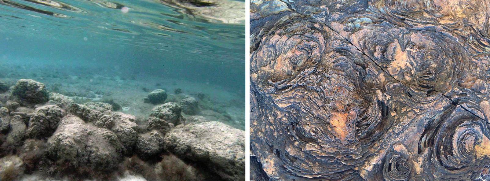 Plate 3.3. Living and fossil stromatolites in the Pilbara region of Western Australia. Left-hand panel shows stromatolites forming in Hamlin Pool, Shark Bay, and the panel on the right shows ancient stromatolite fossils from the Tumbiana region of Pilbara, dated to 2.7 Gya. Credit: Bruce Damer.