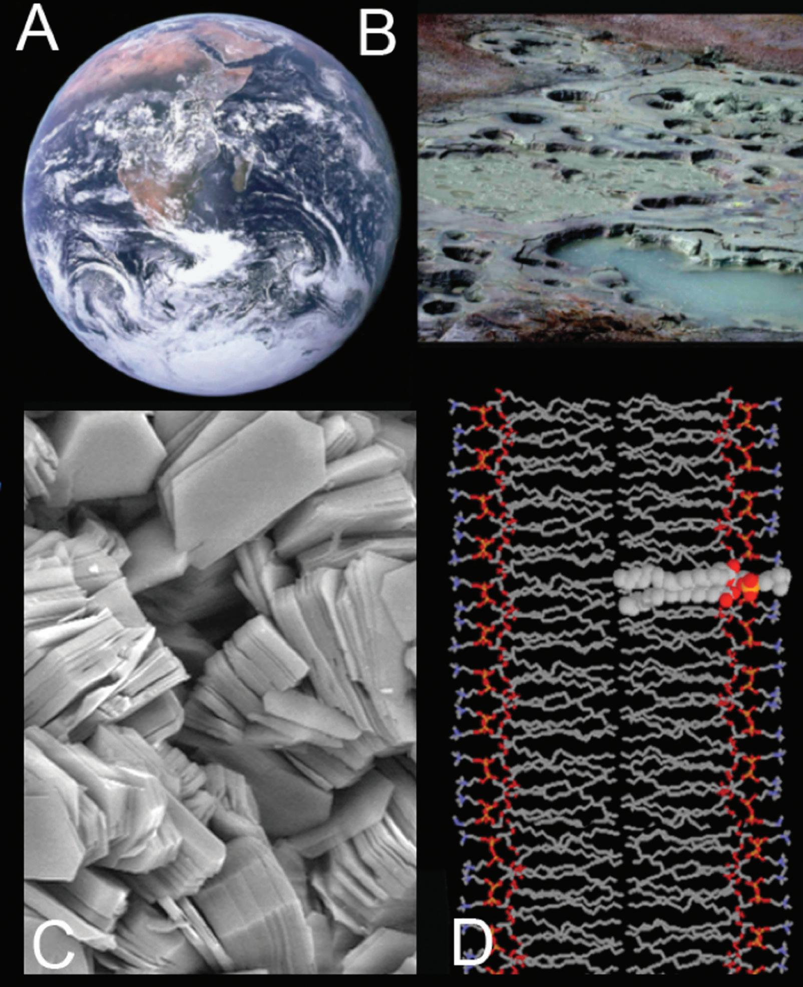 Plate 2.2. The four scales illustrated: The global scale of the Earth (A), the local scale of a hydrothermal field (B), the microscopic scale of clay particles (C), and the nanoscale of a lipid bilayer membrane (D).