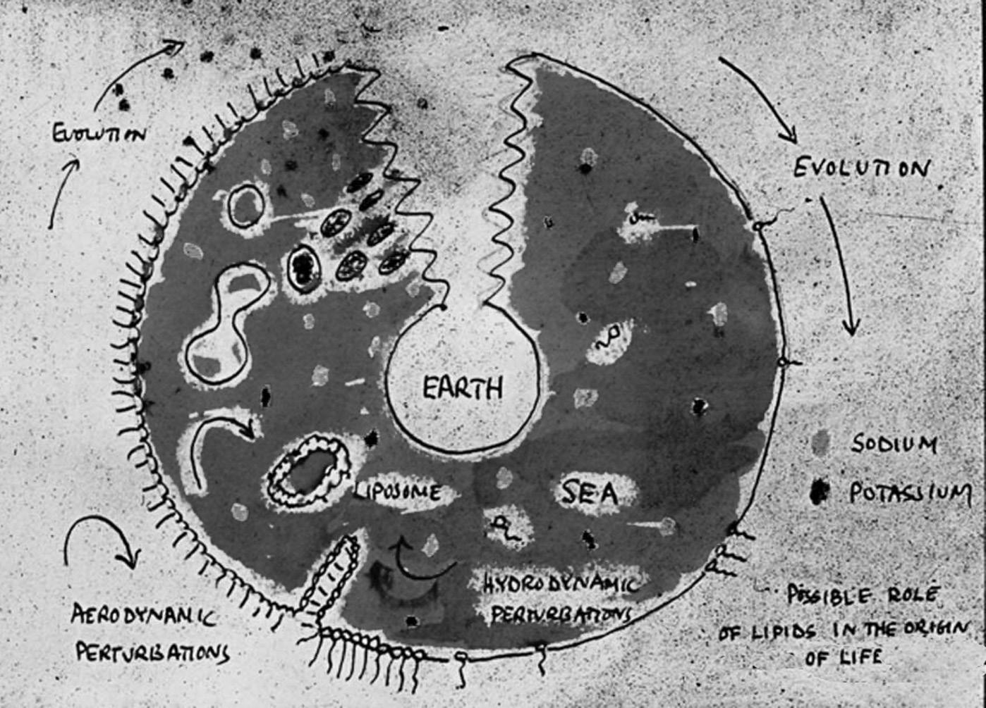Figure P.1. How microscopic compartments could assemble from lipids in the prebiotic ocean. Credit: Alec Bangham; from a lecture presented in 1971.