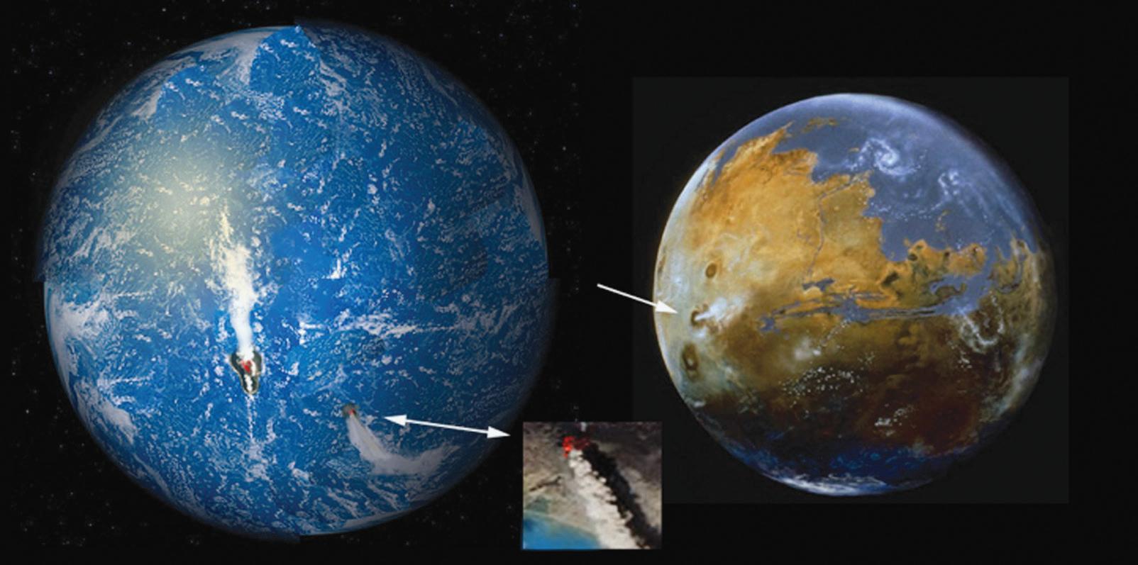 Plate 1.1. The early Earth and Mars were both supplied with water that formed a global ocean on Earth and shallow seas on Mars. Volcanoes, indicated by arrows, emerged on both planets. Source: Assembled by author from public domain images.