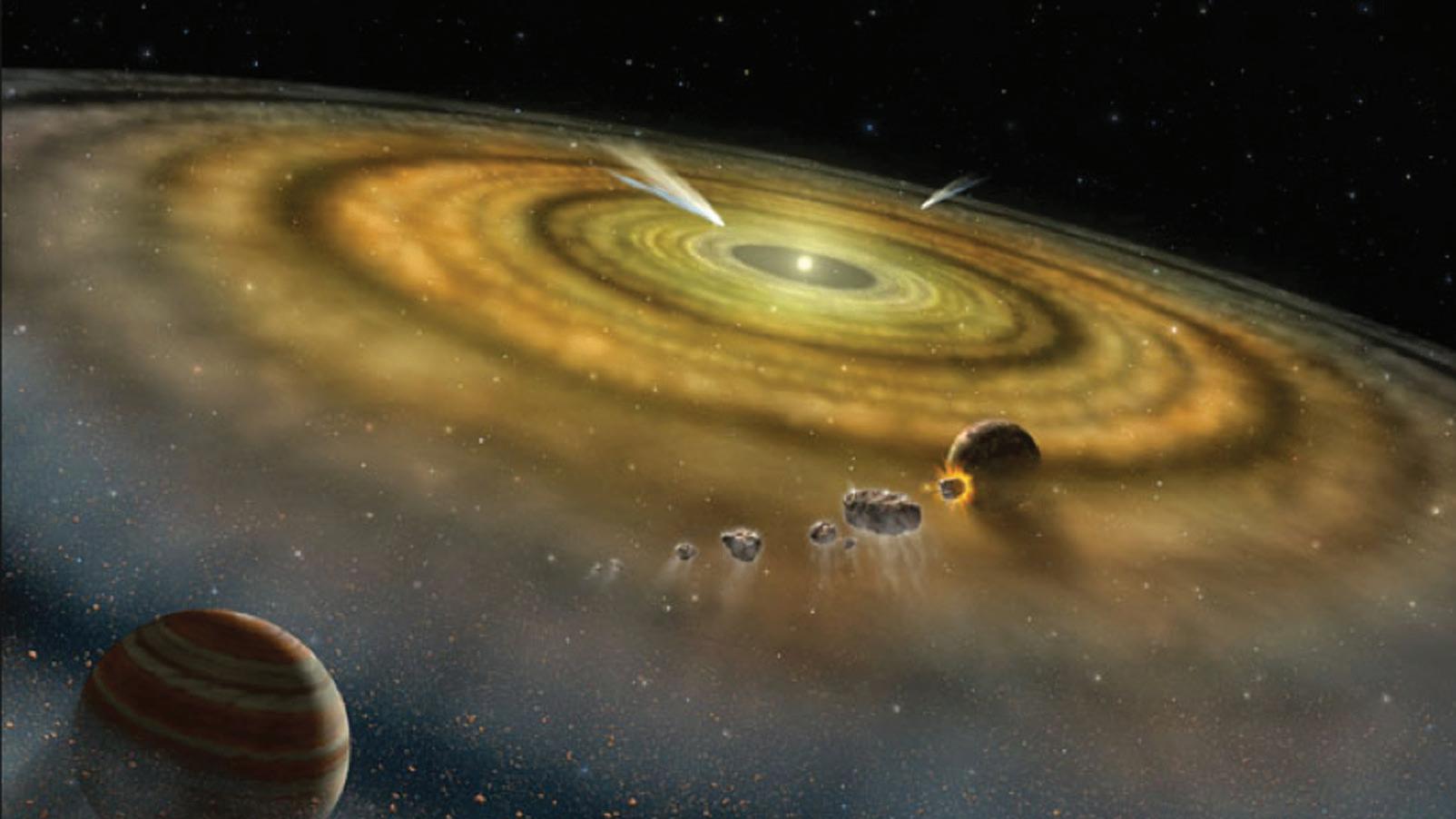 Plate 4.2. Overview of solar system formation showing accretion of planetesimals, comets, and dust particles that deliver organic compounds to planetary surfaces. Image adapted from public domain.