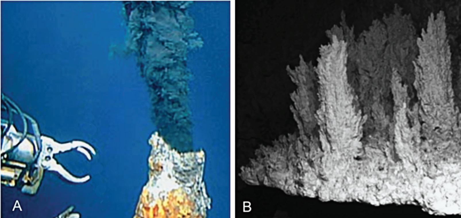 Plate 3.1 A hydrothermal vent emitting “smoke” composed of iron-rich mineral particles (A). The white carbonate mineral structures of an alkaline vent (B). Adapted from public domain images.