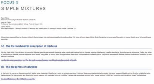 The main text retains Examples (where we guide the reader through the process of answering a question) and Brief illustrations (which simply indicate the result of using an equation, giving a sense of how it and its units are used). In this edition a few Exercises are provided at the end of each major section in a Topic along with, in the e-book, a selection of multiple-choice questions. These questions give the student the opportunity to check their understanding, and, in the case of the e-book, receive immediate feedback on their answers. Straightforward Exercises and more demanding Problems appear at the end of each Focus, as in previous editions.