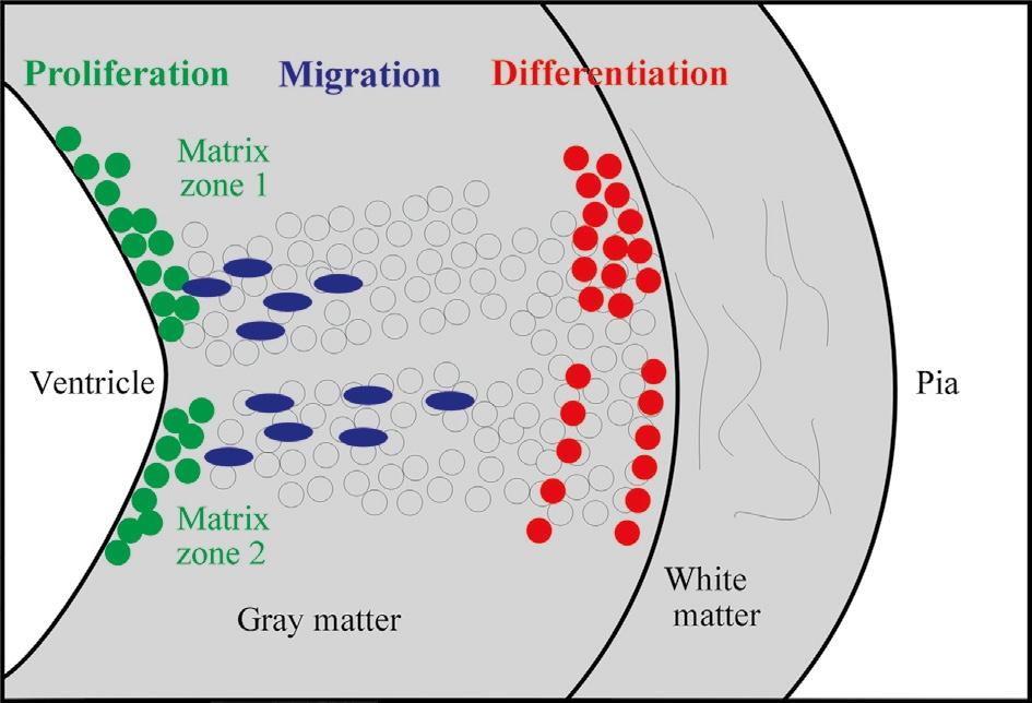 Fig. 2. Schematic transverse view of the developing vertebrate neural tube wall emphasizing distribution of proliferative, migrating, and differentiating neural cells from ventricle to pia.