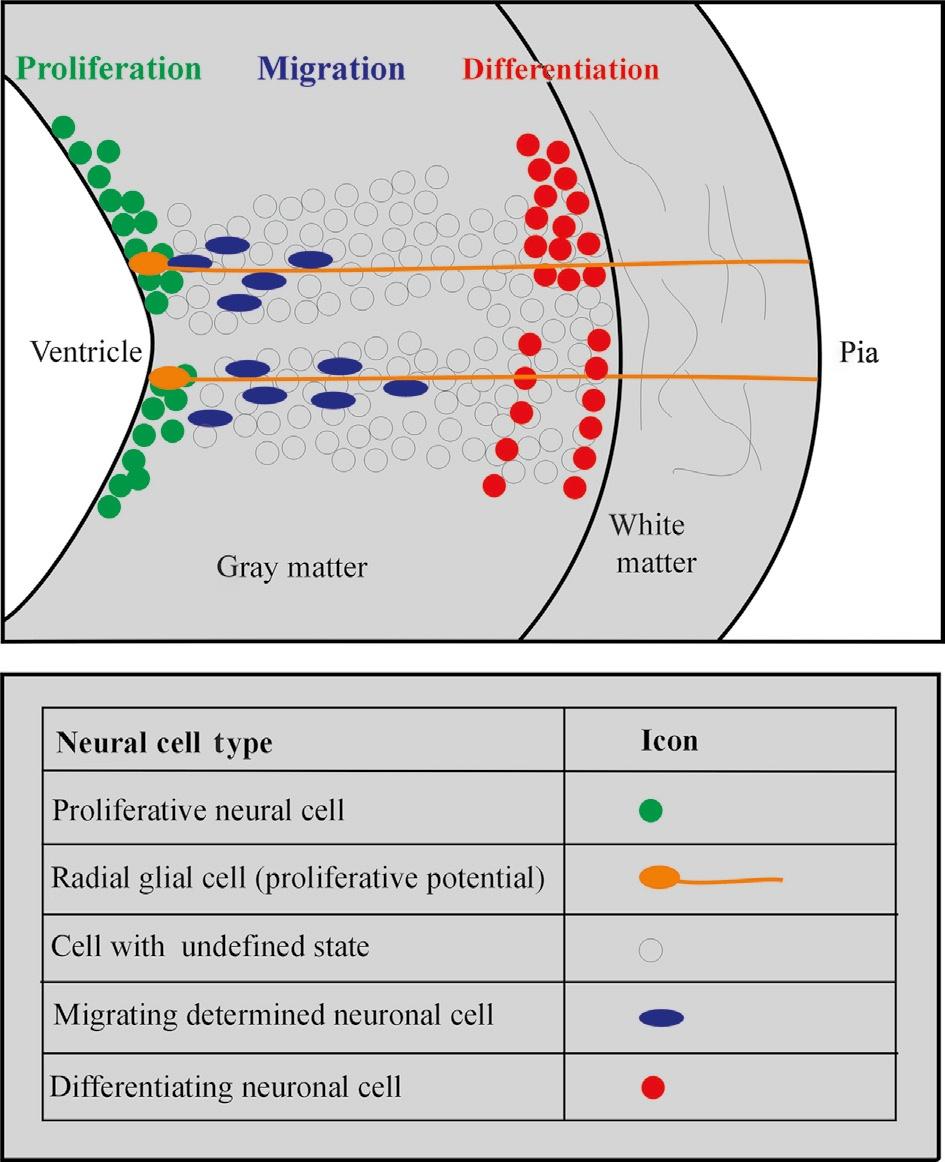 How do freshly postmitotic neural tube cells born at the ventricle manage to migrate peripherally once the neural tube goes beyond the stage of the ubiquitously proliferative pseudostratified epithelium? Already Ramón y Cajal (1890), among other contemporaries, documented the cytology and histology of an early differentiated neural cell type, the radial glia cell, which exhibits a periventricularly located cell body and a long peripheral (radial) process extending toward the pial surface (Fig. 5), therefore resembling somewhat the earlier proliferative neuroepithelial cells forming the pseudostratified epithelium. However, the role of radial glia in the guidance of peripherally migrating neural tube cells has been addressed only in the 1970s (Rakic, 1971, 1972, 1974), and its dynamics and molecular basis are best documented in mammalian isocortex (neocortex) and cerebellum (Rakic, 1988, 2002, 2003a,b; Hatten, 1990, 1993, 1999, 2002). Apparently, both the action of diffusible repellents/attractants and of surface-mediated interactions with radial glia processes are closely intertwined in the process of peripheral migration of neural cells (Rakic, 2003b). The latter have been mostly believed to originate from precursor cells different from radial glia cells.