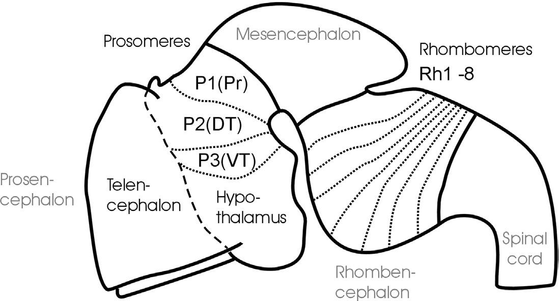 Also forebrain neuromeres have been rediscovered in vertebrates recently, and various numbers of such prosomeres were proposed based on new data (Puelles et al., 1987; Figdor and Stern, 1993; Puelles and Rubenstein, 1993, 2003). The most prominent contemporary, the so-called neuromeric or prosomeric model by Puelles and Rubenstein (1993, 2003) suggests an overall segmentation of the vertebrate brain and we will discuss this model in some more detail later. Generally, it may be stated that prosomeres (compare with Fig. 1) have not been corroborated equally well using the criteria applied to rhombomeres. However, cellular lineage restriction occurs at the forebrain-midbrain boundary, specifically between pretectum (synencephalon; P1) and mesencephalon (Larsen et al., 2001), and between dorsal and ventral thalamus mediated by the zona limitans intrathalamica (Zeltser et al., 2001). The zona limitans intrathalamica represents a transitory transitional region between dorsal and ventral thalamus, thereby separating and characterizing P2 (posterior parencephalon) and P3 (anterior parencephalon or prethalamus) as neuromeres. The diencephalon has alternatively been reported to contain four neuromeres (Figdor and Stern, 1993) characterized by lineage restriction, that is, two for the synencephalon (P1), and one each for the dorsal (P2) and ventral thalami (P3). Additional potential prosomere boundaries, especially those anterior to P3 (i.e., in the secondary prosencephalon) remain largely unexplored in the context of cellular lineage restriction.