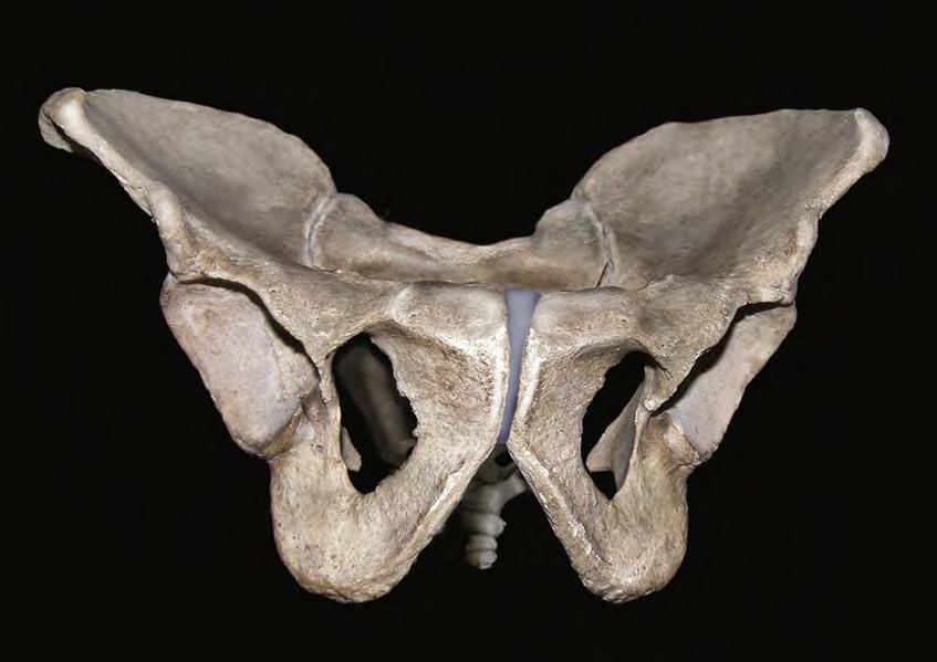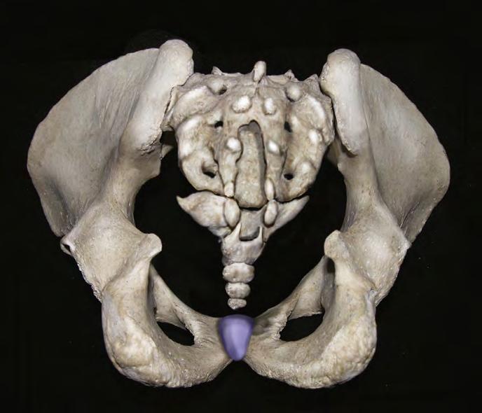 1.1 The pelvic bone consists of the ilium, ischium, and pubis. The ilium is bound to the sacrum at the sacroiliac joints. This anterior aspect of the pelvis shows the pubic arch, symphysis, and obturator foramen via a head-on view.