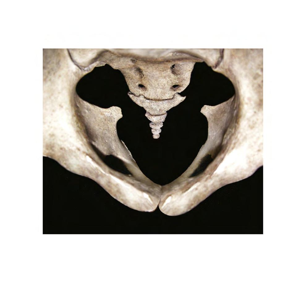 1.3 High-power detail viewed through the pelvic inlet shows the sacrum and coccyx. The anterior sacral foramina are distinct, as are the ischial spines and the subpubic arch.