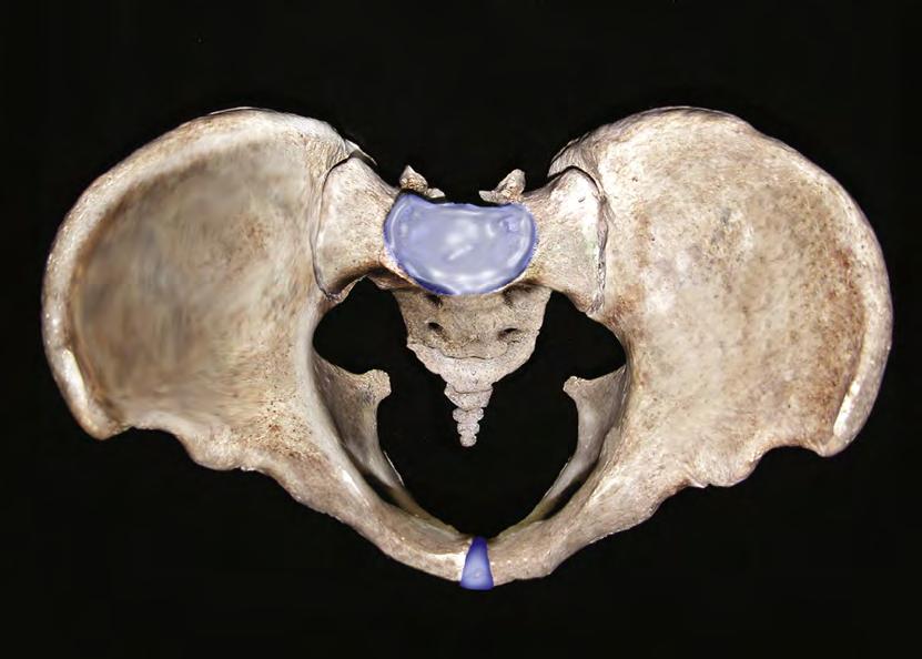 FIG. 1.2 This overhead view details the pelvic inlet, which is bounded anteriorly by the pubic symphysis and the pubic tubercle; laterally by the iliopectineal line and the linea terminalis; and posteriorly by the sacral alae and the first sacral vertebra. This view also nicely shows the ischial spines.