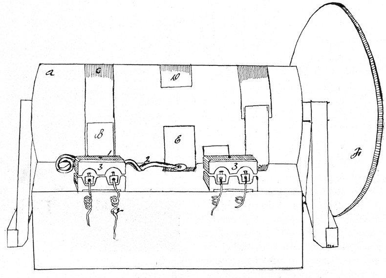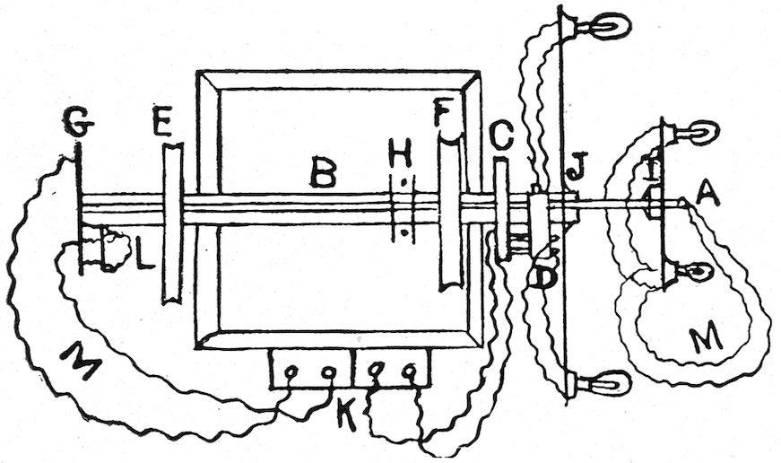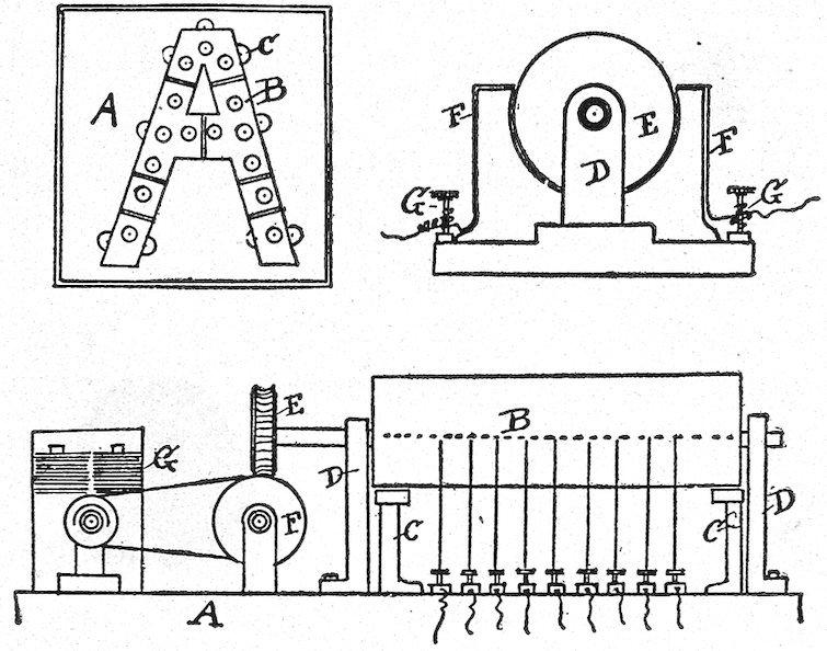 Attach motor to No. 1, then from axle of No. 1 run belt to No. 2, from axle of No. 2 run belt to No. 3, then attach axle of No. 3 to pulley G on cylinder and you have a machine on which you can operate from 1 to 100 incandescent lamps alternately.