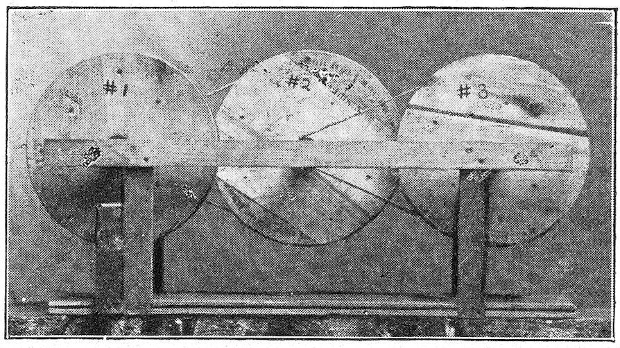 Now, then, for the mechanical part of it: Saw out two wooden disks, twelve inches in diameter, with a ⅞-in hole in the center. Next you procure a piece of slate, fourteen inches square. Take a compass and strike a 12-inch circle. By drawing your compass around several times, you will find it will cut a fairly deep line. You can then take a hammer and by a few light taps break the square edges of your slate, leaving a perfectly round disk of slate. Next, you want a ⅞-inch hole in the center of the slate. Now mount this on the wooden disk; next,