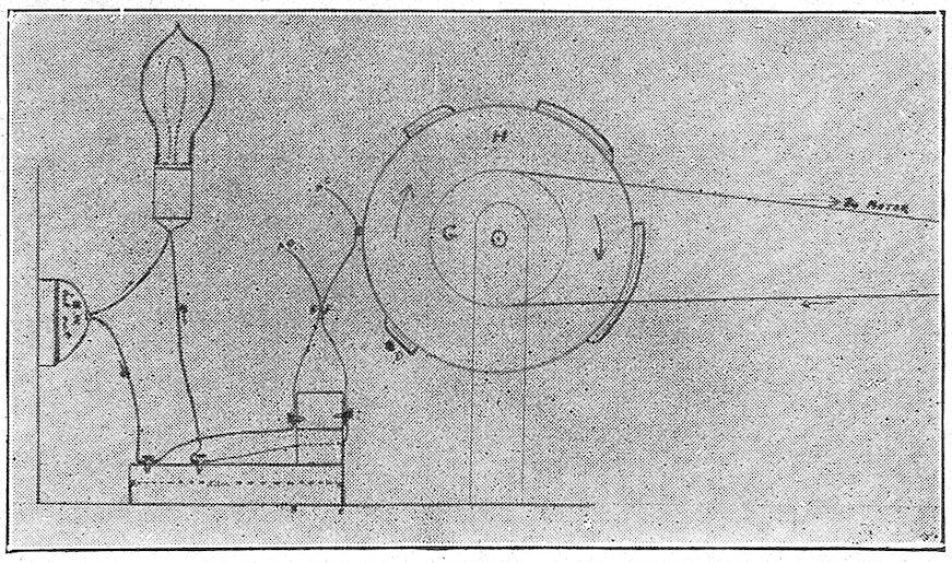 You next make a brush holder. This is a very simple arrangement. The holder is made of wood. Fasten brushes on securely, as shown in F of cut. When automatic switch is set up, it will appear as shown in cut E. Now fasten belt to pulley J, and then to motor, as shown in cut. This switch should make 300 revolutions per minute. As the brushes strike each section on the contact plate, it causes a wave of light to pass through that section of stripes or stars, as the case may be.