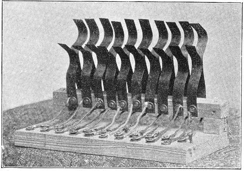 F F are made of spring copper cut in strips ⅜ of an inch wide and bent to shape, then fastened in base with screws and washer.