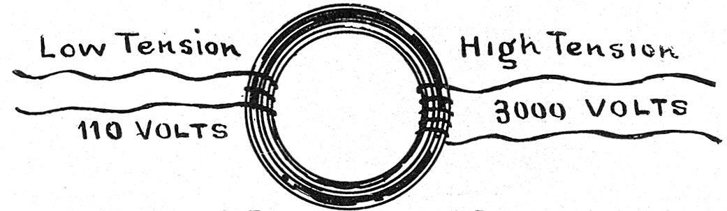 The “transformer” is a device for reducing the current from one potential or tension to another, and consists of a ring of many turns of insulated wire; the high tension wire is then wound around and through this ring several turns, and the low tension wire carrying the current into the building is wound around the opposite side of the ring in like manner. The difference in pressure is controlled by the number of turns around the ring on either side, as shown.