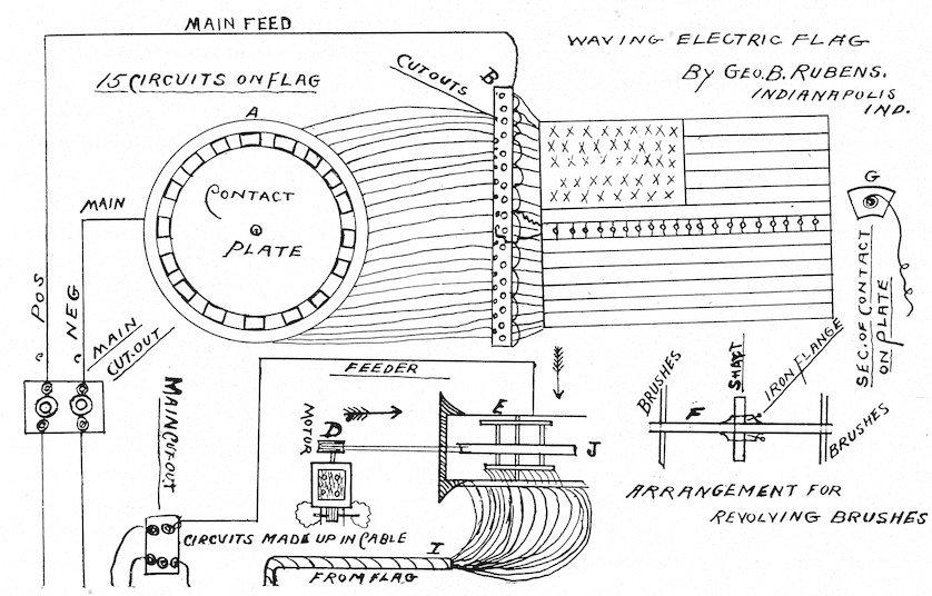 Remember, each wire running from the disk must run into cut-out and from cut-out to the flag (see cut B). Also note how wire is soldered on in G. You can bunch and group all wires from A, and form them into a cable, as shown in cut I, as they are all of one polarity.