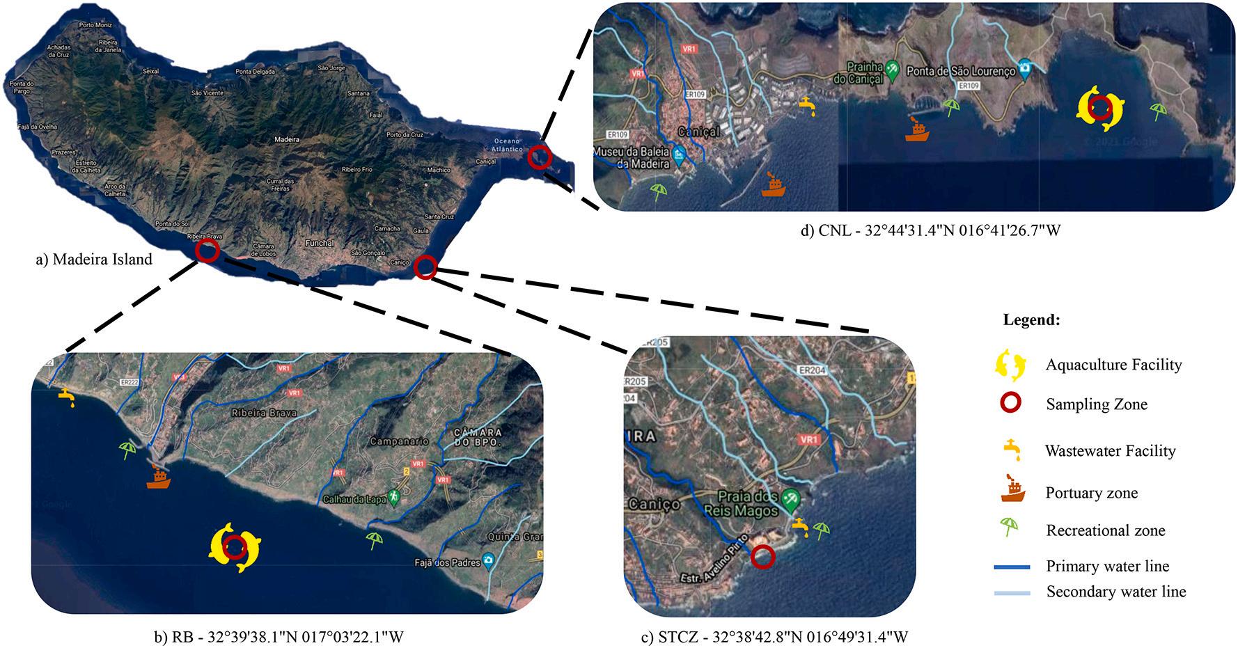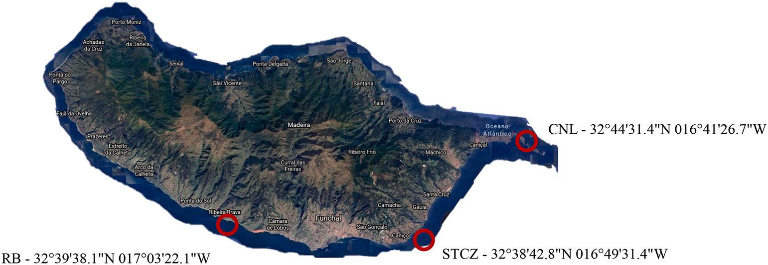 The samples collection was performed at three locations presented in Fig. 1 Two associated with fish farm facilities, one located at Campan ´ ario, in Ribeira Brava (RB), Madeira (32◦ 39′ 38.1”N 017◦ 03′ 22.1”W) and the other in Baía d’Abra, Caniçal (CNL), Madeira (32◦ 44′ 31.4”N 016◦ 41′ 26.7”W). The third place was chosen between farms locations at Caniço, Santa Cruz (STCZ), Madeira (32◦ 38′ 42.8”N 016◦ 49′ 31.4”W).