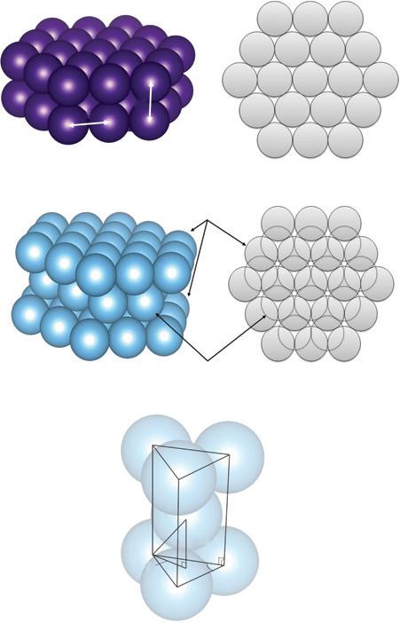 Thethirdlayerisalignedwiththefirst,thefourthwiththesecondetc.,asifwewere stackingcannonballs(ororanges).Theunitcell,whichconsistsofboththefirst andsecondlayers,nowhasthreeextraatoms,foratotalofsix.Thecellvolumeis againtheproductofthehexagon’sareaand c,whichwewouldliketocalculatein termsof a