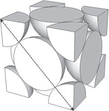 Surelywecandobetter!Whatifweplaceasingleatomatthecenterofthecube [(x, y, z) = a 1 2 , 1 2 , 1 2 ]andpositiontheothersattheverticesasshowninFig.1.4b? Thisarrangementisknownas body-centeredcubic (bcc).Ifthesphereatthecenter justtouchesthecornerspheres,thediagonalofthecube(withlength √3a)spans twospherediameters.Thereareeightspheresinthecorners,eachsharedbetween eightadjacentcells.Countingthesphereatthecenter,thismeansthateachcubic cellenclosestwospheresofdiameter √3a/2.Thepackingfractionisthen