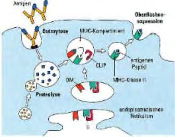 NachPhagozytosedesAntigensundanschließender.rragmentierunguttPhagolysosomwerdendieAg-FragmentemitdenMHCll-lv'lolekülenzusammengebracht,dieimERS)'Dlhctisiertwurden. l'vlHC-ll-MolekülesindzunächstmilinvarlatenKettenblockiert, welchedie.BeladungmitkörpereigenenProteinenverhindernund gleich:t:e1tigdenTransportderKlasse-II-Molekülezudenexogenen ,o\ntigenenindiel'hagolysosomenbegünstigen.ImsaurenMilieu desPhagolysosomswerdendieinvarlateKetteausdemIvlll.C-ll· .Molekülgelöst,dasKlasse-II-MolekülmitdemProteinantigenbeladenunddergesamteKomplexandieZdlobcrllächeverbracht (-+Abb.3..2).