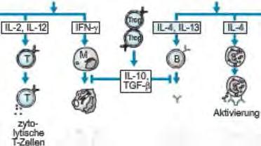 undlFN-y(AktivierungvonMakrophagen).Umsekretorischaktiv2.uwerden,müssenderTHl-ZelleAntigenemittelsMHC-11 undkostirnulatorischel\toleküledargebotenwerden.Danebenak tiviertIL-12aus11akrophagendie'l'HI-Ze11en,währendlL-4und lL-10ausTJI2-ZellendieTH1-Zellenblocken.